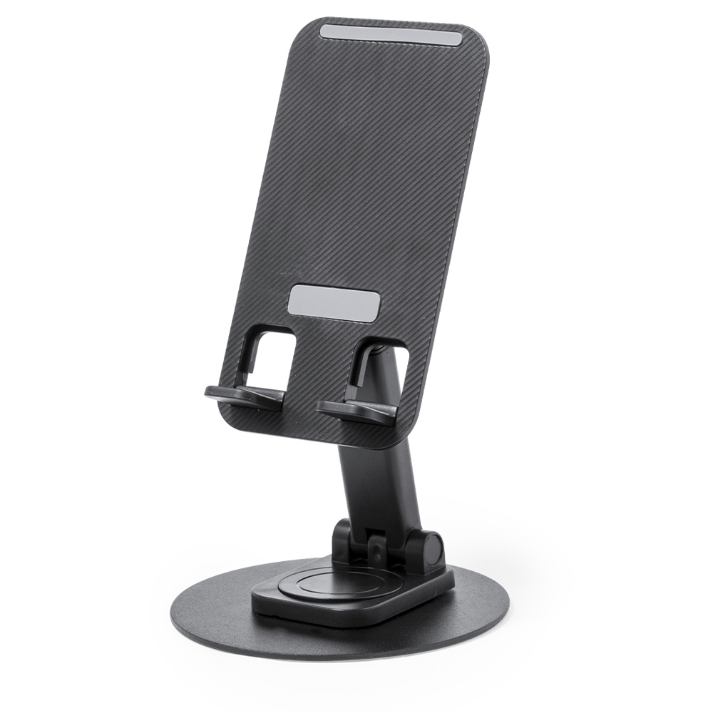 Opvouwbare houder voor smartphone en tablet, gemaakt van duurzaam aluminium en ABS. In hoogte verstelbaar, met antislip rubberen pads op basis en houder. In sobere witte of zwarte afwerking en met groot merkoppervlak. Gepresenteerd in een aantrekkelijke designdoos.