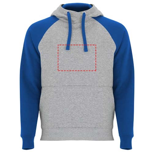 Tweekleurige unisex hoodie. Capuchon met gekruiste hals en metalen oogjes. Contrasterende binnenkant van de capuchon, trekkoord en raglanmouwen. Kangoeroezak. Manchetten en zoom van 1x1 ribgebreid elastaan. Verwijderbaar label.