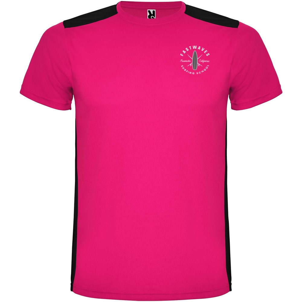 Gemakkelijk drogende, technische en ademende stof. Ronde hals. Combinatie van twee polyesterstoffen op de rug en schouders. Birdseye-stof aan de voorkant en ademende 3D-meshstof aan de achterkant. Stof voorbereid voor vochtopname. Decoratieve zigzagsteek aan de zijkanten en schouders. Rugpatroon is iets langer. Verwijderbaar label.