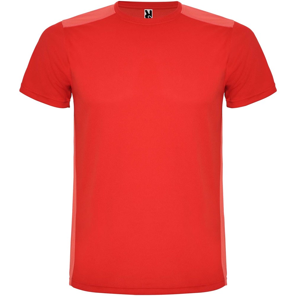 Gemakkelijk drogende, technische en ademende stof. Ronde hals. Combinatie van twee polyesterstoffen op de rug en schouders. Birdseye-stof aan de voorkant en ademende 3D-meshstof aan de achterkant. Stof voorbereid voor vochtopname. Decoratieve zigzagsteek aan de zijkanten en schouders. Rugpatroon is iets langer. Verwijderbaar label.