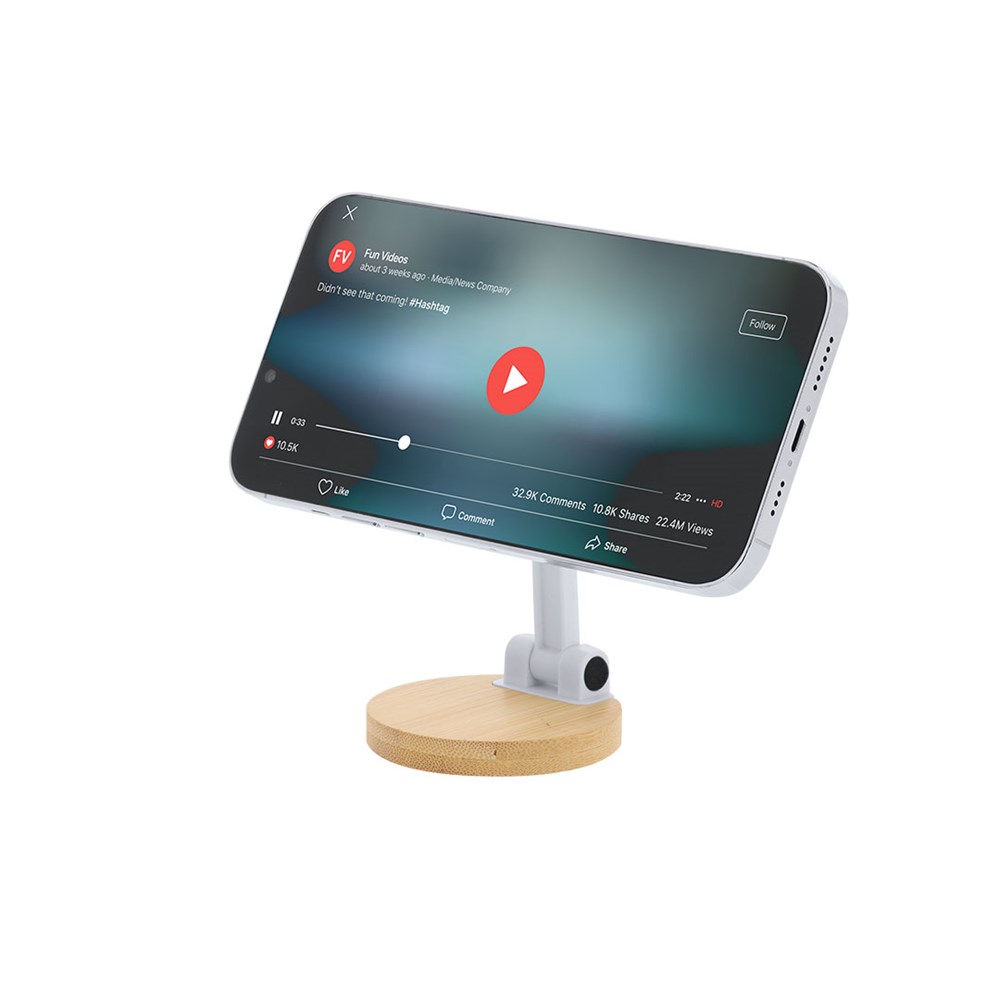 Vouwbare steun voor smartphones. Met magnetische bevestiging, MagSafe en een verstelbare positie voor meer comfort. Inclusief een metalen sticky ring.Materialen zoals bamboe bevorderen het gebruik van natuurlijke grondstoffen en verminderen de uitstoot van verontreinigende stoffen. Het komt van een snelgroeiende en regenererende plant, wat het een uitstekende aanvulling maakt op het gebruik van traditionele houtsoorten.
