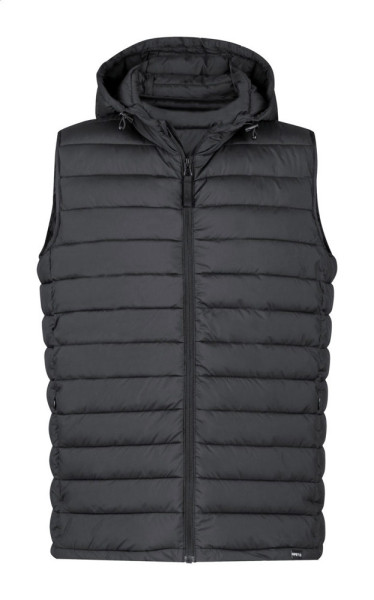 Wind- en waterafstotend bodywarmervest met ritssluiting, zijzakken met ritssluiting en verstelbare capuchon. Met RPET polyester zakje. 100% RPET-polyester met opvallend RPET-label.