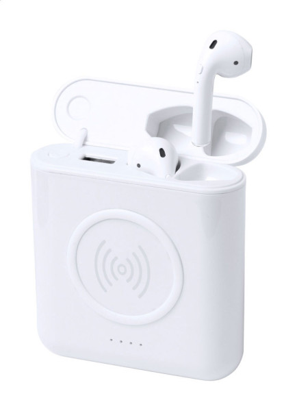 Plastic USB powerbank met 5000 mAh batterij, ingebouwde draadloze oplader (5W) en true wireless stereo (TWS) oortelefoon met handsfree gespreksfunctie. USB-C ingangspoort. Inclusief USB-laadkabel.