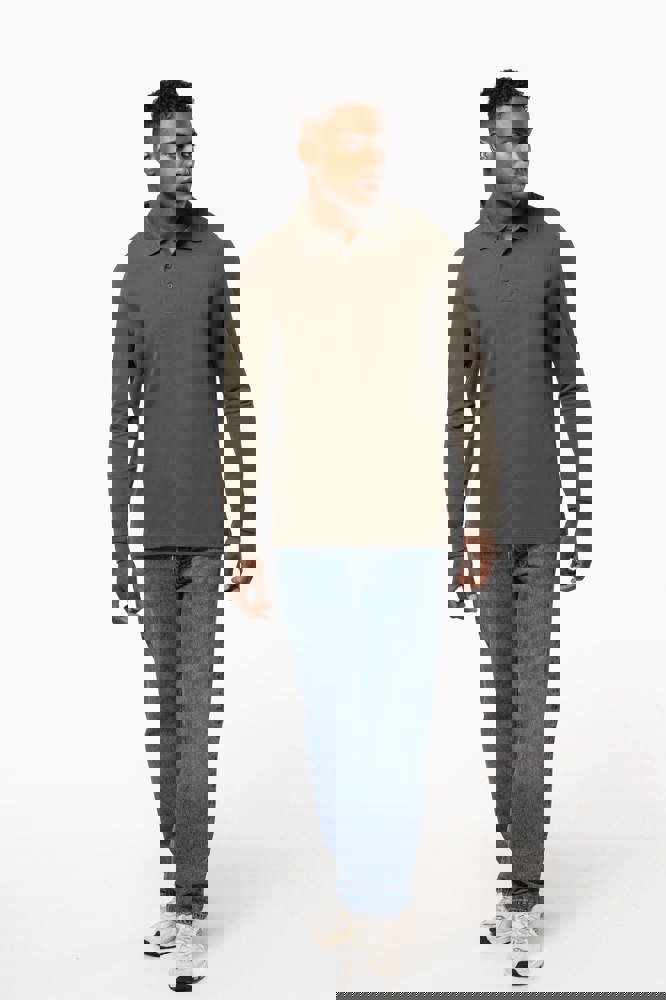 100% gekamd katoen - wasbaar op 60°C (Oxford Grey : 90% katoen / 10% viscose - wasbaar op 40°C). Piqué. Kraag in rib. Nektape en zijsplitjes in Oxford Grey voor alle kleuren behalve Oxford Grey daarvan zijn ze Dark Grey. Knooplijst met 3 knopen. Afwerking met dubbele stiksels aan de onderkant. Mouwuiteinden in rib.