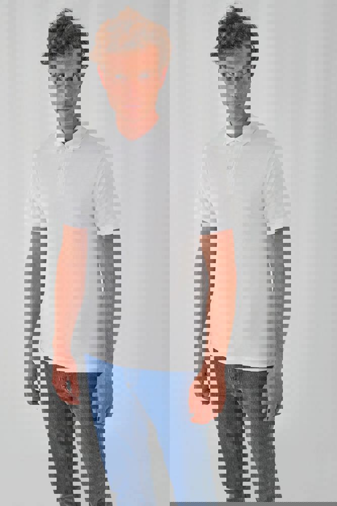 100% voorgekrompen ringgesponnen katoen (Heather Grey: 90% voorgekrompen ringgesponnen katoen / 10% viscose). Platte gebreide kraag in 1x1 rib. Mouwen niet in rib. Nektape. Verstevigde knooplijst met 2 toon op toon knopen. Zijnaden.