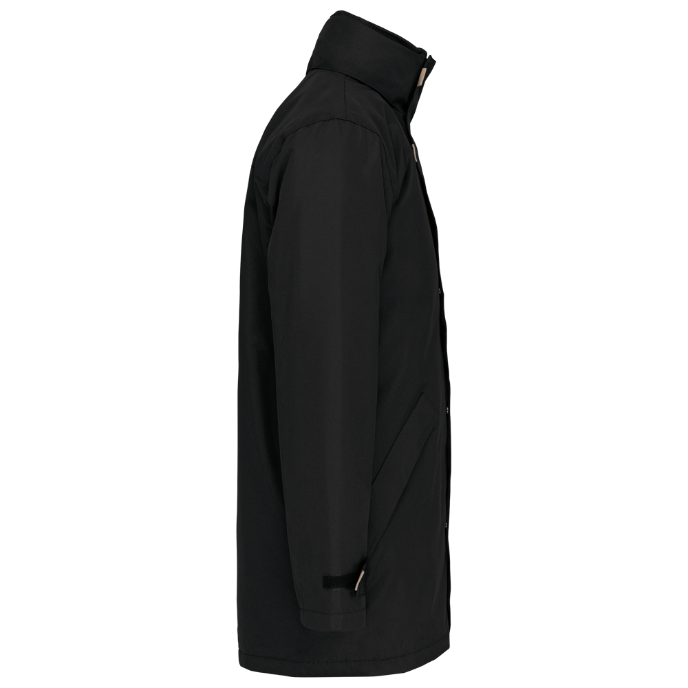 Buitenkant: 100% oxford polyester. Binnenkant: gewatteerd polyester. 2 voorzakken met rits. 2 binnenzakken waarvan 1 voor de GSM. Afneembare capuchon in de kraag. Kraag gevoerd met fleece. Drukkersrits. Waterdichte naden. Ritssluiting verborgen onder een lijst met drukknopen en klittenband. Verstelbare mouwuiteinden.