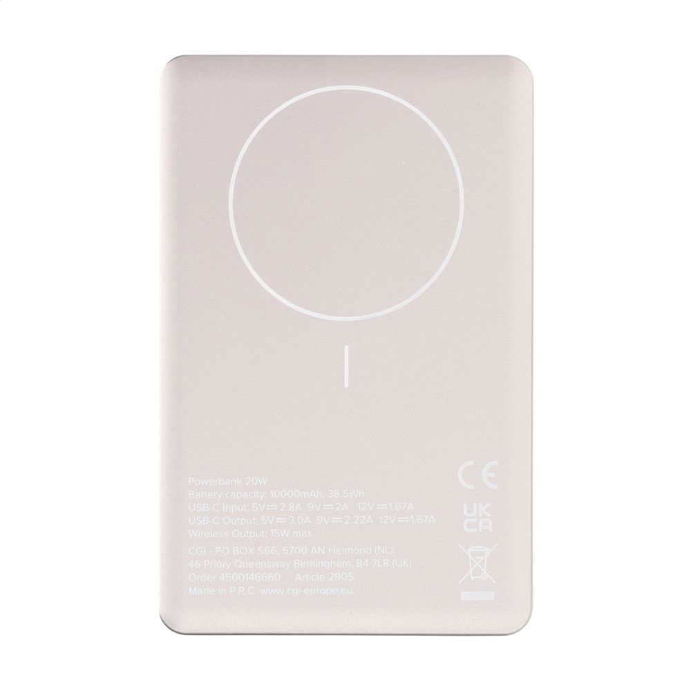 Ultralichte, krachtige en draadloze powerbank met ingebouwde 10.000 mAh lithium-polymeerbatterij. Voor het snel opladen van een smartphone. De behuizing is gemaakt van 100% RCS-gecertificeerd gerecycled aluminium. Een handzaam formaat dat je gemakkelijk meeneemt in je broekzak. USB-C input: 5V/3A 9V/2A. USB-C output: 5V/3.0A 9V/2.22A 12V/1.67A. Wired output: 20W. Wireless output: 15W met magnetische functie (MagSafe). Klik je iPhone op de magneet. De geïntegreerde magneten in de oplader zijn perfect uitgelijnd en zorgen altijd voor de juiste oplaadpositie van de iPhone. Compatible met iPhone 12 en hoger. Voorzien van indicatielampjes en aan/uitknop. Inclusief rTPE oplaadkabel USB-C/USB-C en gebruiksaanwijzing. Per stuk verpakt.