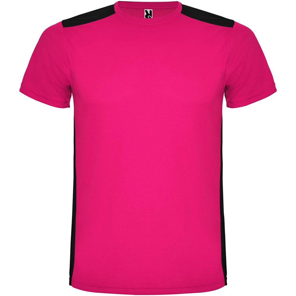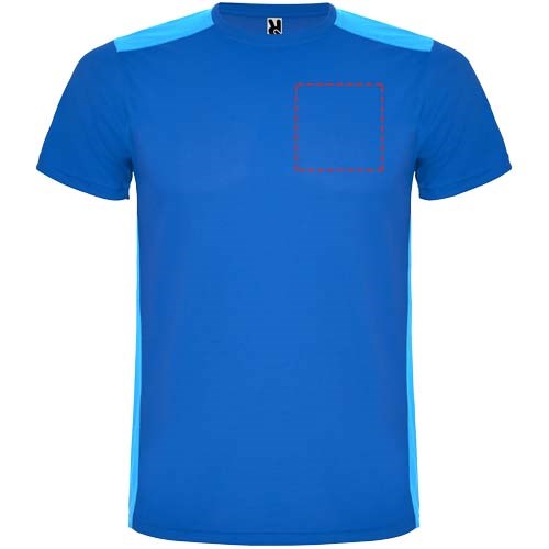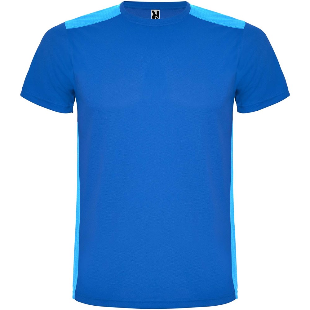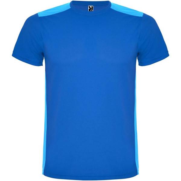 Gemakkelijk drogende, technische en ademende stof. Ronde hals. Combinatie van twee polyesterstoffen op de rug en schouders. Birdseye-stof aan de voorkant en ademende 3D-meshstof aan de achterkant. Stof voorbereid voor vochtopname. Decoratieve zigzagsteek aan de zijkanten en schouders. Rugpatroon is iets langer. Verwijderbaar label.