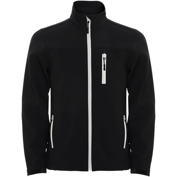 Tweelaags softshell. Omgekeerde rits met verzegeld effect, bijpassende kinbeschermer en ritstrekker. Uitgesneden detail op de borst. Drie zakken met rits en bijpassende trekker. Klittenbandsluitingen in de manchetten. Verstelbare zoom onderaan met elastisch trekkoord en stoppers. 1000 mm waterbestendig. Winddichte stof. Het model is 185 cm en draagt maat M.