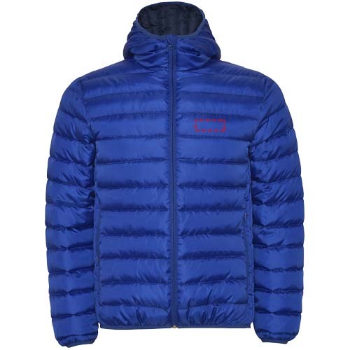 Gewatteerde herenjack met dons en aansluitende capuchon. Omgekeerde ritsen met bijpassende kinbeschermer. Twee voorzakken met rits. Bijpassende elastische bies in manchetten, zoom en capuchon. Contrasterende binnenvoering. Licht en opvouwbaar kledingstuk. Waterafstotend. Winddicht model.