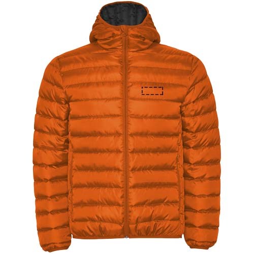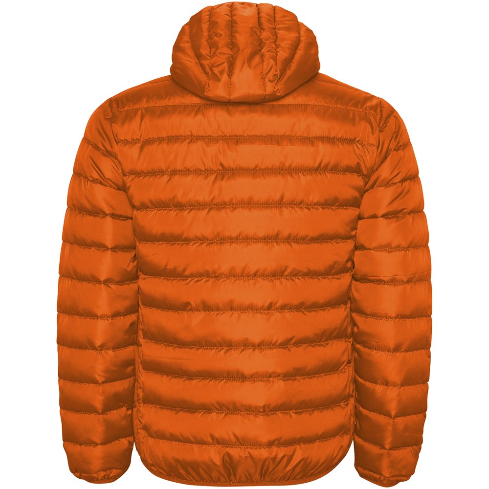 Gewatteerde herenjack met dons en aansluitende capuchon. Omgekeerde ritsen met bijpassende kinbeschermer. Twee voorzakken met rits. Bijpassende elastische bies in manchetten, zoom en capuchon. Contrasterende binnenvoering. Licht en opvouwbaar kledingstuk. Waterafstotend. Winddicht model.