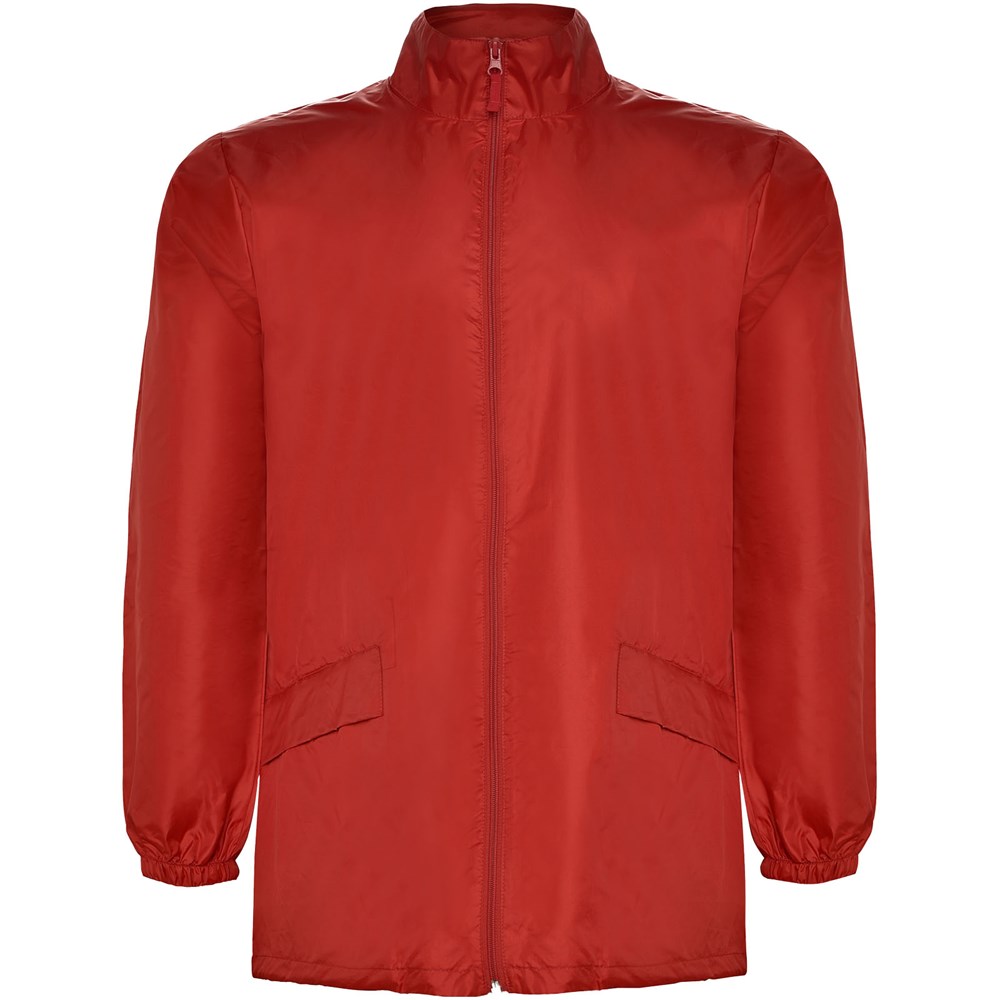 Waterdichte regenjas. Staande kraag en opvouwbare capuchon met verstelbaar trekkoord. Rits aan de voorkant met bijpassende trekker. Twee zijzakken met klep. Elastische manchetten. Elastische band in de zak voor opvouwen en opbergen. Waterdicht model. Het model is 185 cm en draagt maat L.