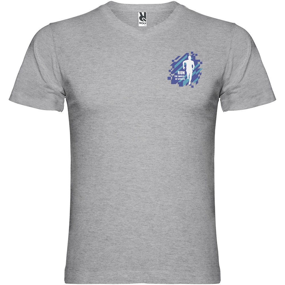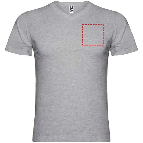 Buisvormig T-shirt met korte mouwen en tweelaags V-hals. Versterkte bedekte naden in kraag en schouders. Verwijderbaar etiket. Het model is 190 cm en draagt maat L.