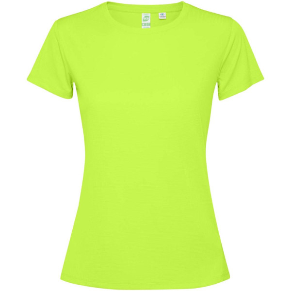 Getailleerd technisch T-shirt met korte mouwen voor dames. Kraag met bijpassende naden. De zoom aan de achterkant is iets langer dan aan de voorkant. Zijnaden naar voren verschoven.