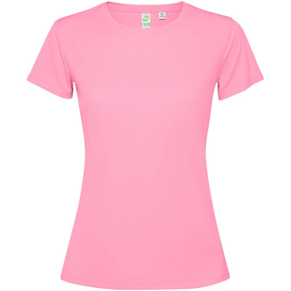 Getailleerd technisch T-shirt met korte mouwen voor dames. Kraag met bijpassende naden. De zoom aan de achterkant is iets langer dan aan de voorkant. Zijnaden naar voren verschoven.
