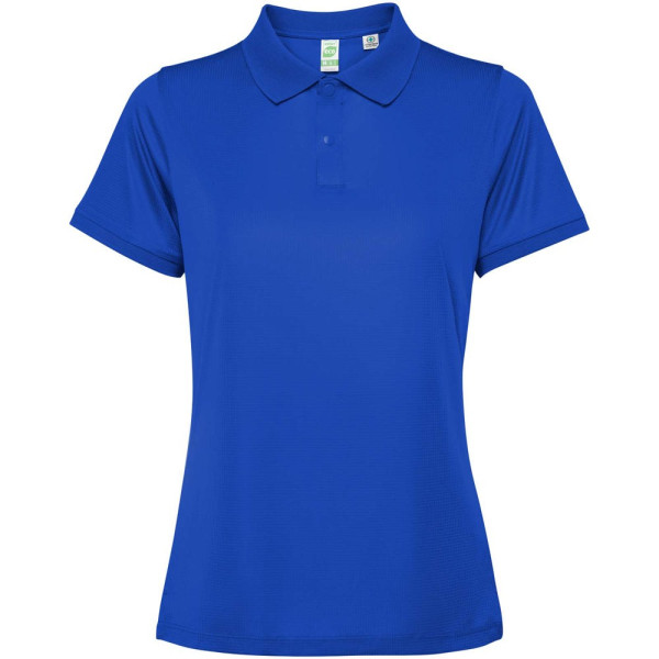 Getailleerde damespolo met korte mouwen. Versterkte bedekte naden in de binnenkraag. 1x1 geribde manchetten en kraag. Zijnaden. Knoopsluiting met 3 knopen en zijsplitten.