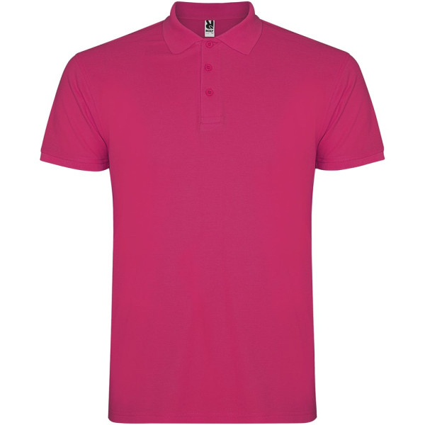 Poloshirt met korte mouwen voor heren. Versterkte bedekte naden in de binnenkant van de kraag. 1x1 geribde manchetten en kraag. Zijnaden. Knoopsluiting met drie knopen en zijsplitten. Optionele zak. Verwijderbaar etiket. Het model is 185 cm en draagt maat L.