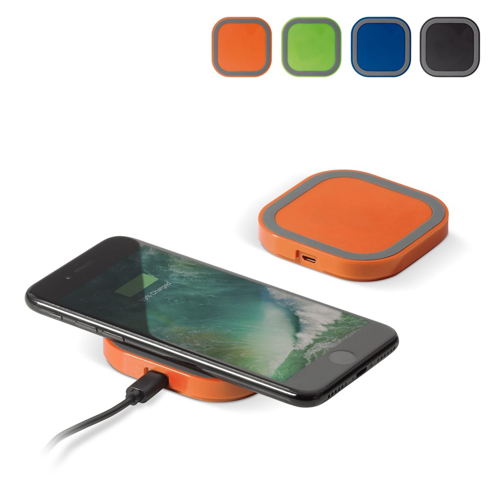 Draadloos laadstation 5 Watt. Plat, klein en kleurrijk met rubberen rand. Dit voorkomt dat de telefoon van het oplaadstation glijdt. Wordt verpakt in geschenkverpakking.