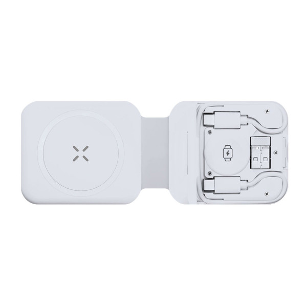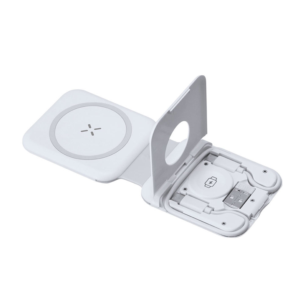 Volledige 15W draadloze multicharger met een 3-in-1 opvouwbare gadgetstandaard. Ontworpen voor gelijktijdig opladen van smartphone/koptelefoon en smartwatch: een alles-in-één laadstation. Bevat een set Type C-kabels en een USB-adapter, geschikt voor gegevensoverdracht.