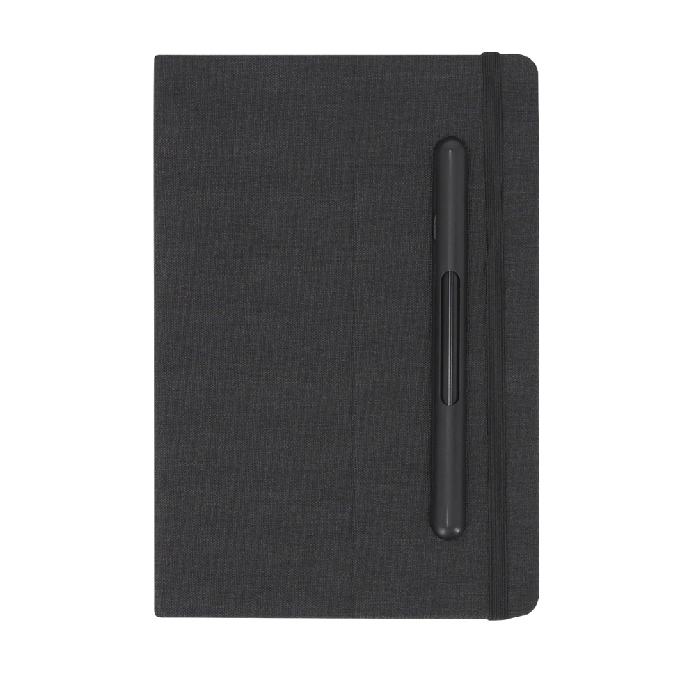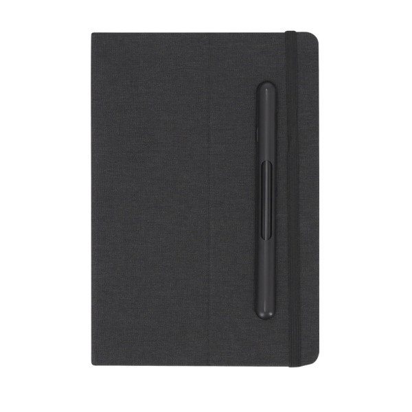 Notepad-standaard met stijve deksels van 600D RPET. Veelzijdige ondersteuning geïntegreerd in de hoes. Bevat eeuwige potloodpen. Bevat 96 binnenplaten die verkrijgbaar zijn met een streep. Het heeft een elastische sluiting. Met RPET-logo.