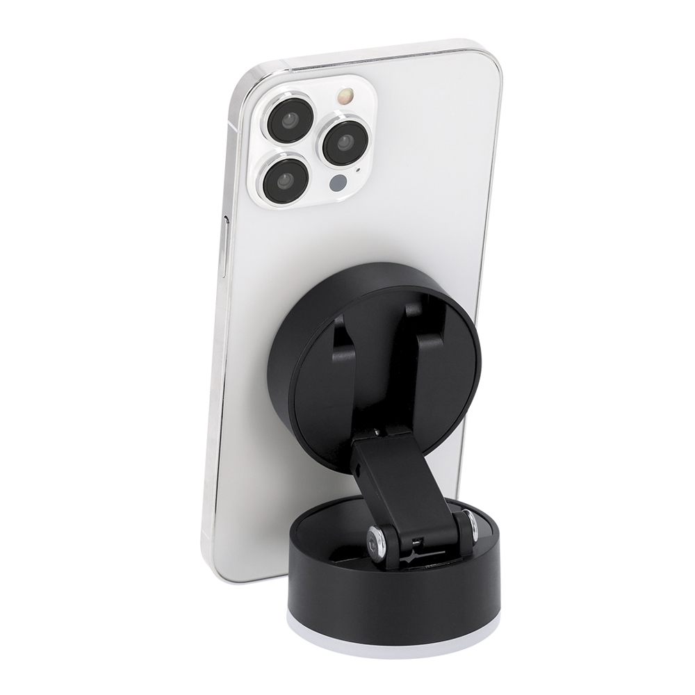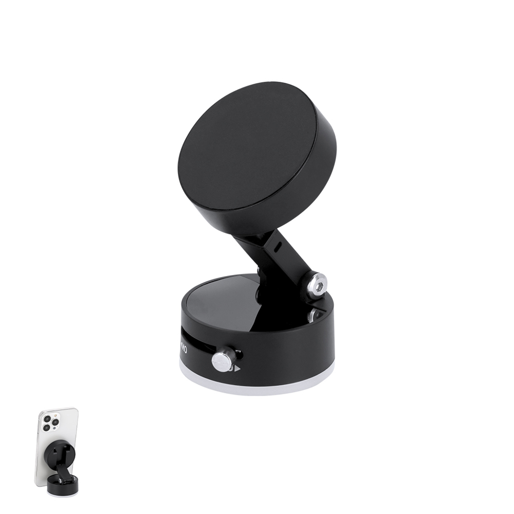 Magnetische telefoonhouder in ABS. Zuignapbevestiging met AAN/UIT aan/uit-knop. Inclusief magnetische metalen ring. Hij heeft een verstelbare, uitschuifbare standaard, ideaal als oplossing om je apparaat stabiel en veelzijdig op elk oppervlak te bevestigen.