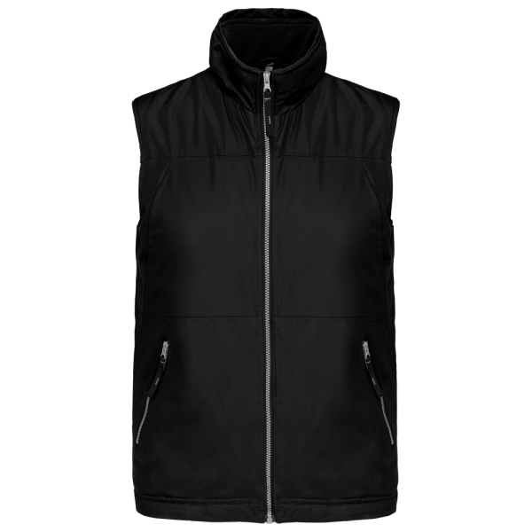 Buitenkant van 100% polyester met PVC inductie. Samengestelde voering van polyamide, polyester en polyesterwatten. Kangoeroezakken met rits aan de voorkant. Ritssluiting. Fleecevoering en wattering aan de bovenzijde en aan de kraag. Polyamidevoering aan de onderzijde. Binnenzak voor GSM. Afgeronde onderkant. Elastisch aanrijgkoord met stopper onderaan. Drukkersrits.