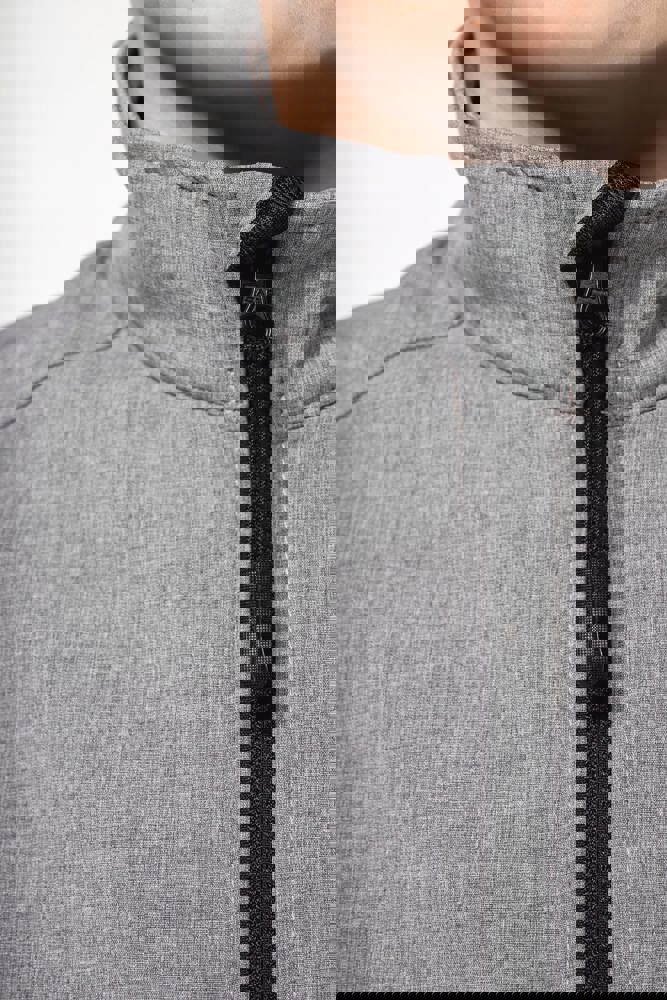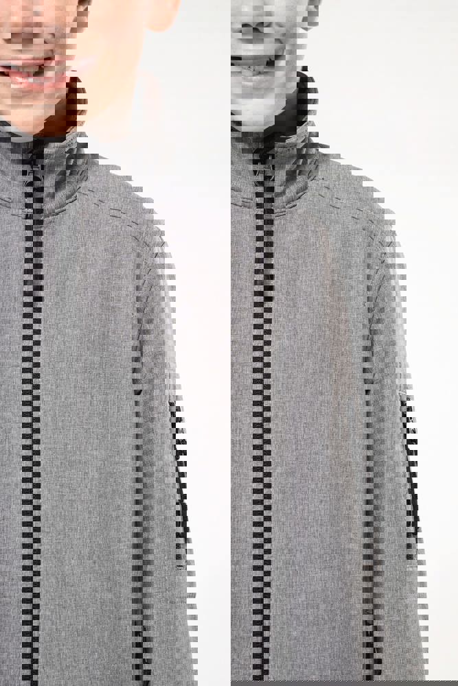 Stof in 3 lagen aan elkaar geklit, ademend 3000 g/m2/24H en 8000 mm waterdicht. Buitenkant: 95% polyester / 5% elasthan. Tussenlaag: ademend membraan. Binnenkant: microfleece. Ritssluiting. Zakken met rits aan de voorkant. 1 zak met rits op de linkermouw.