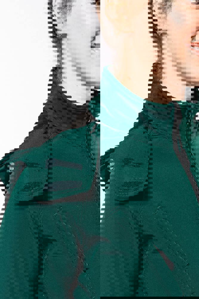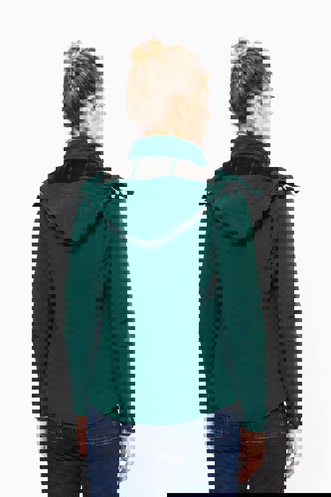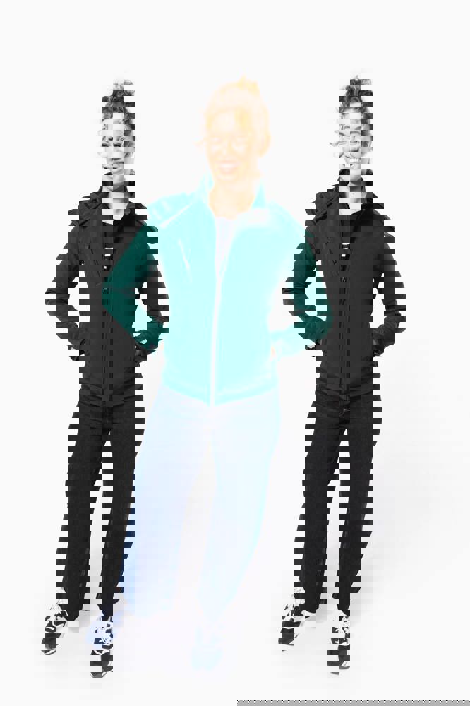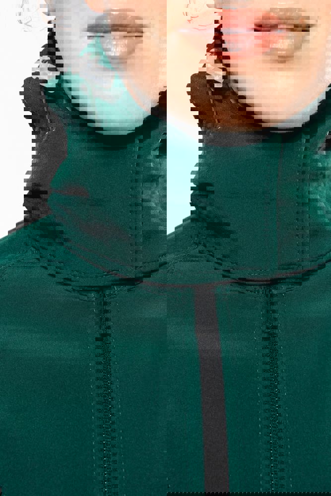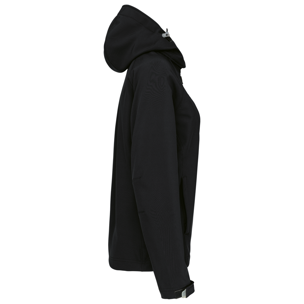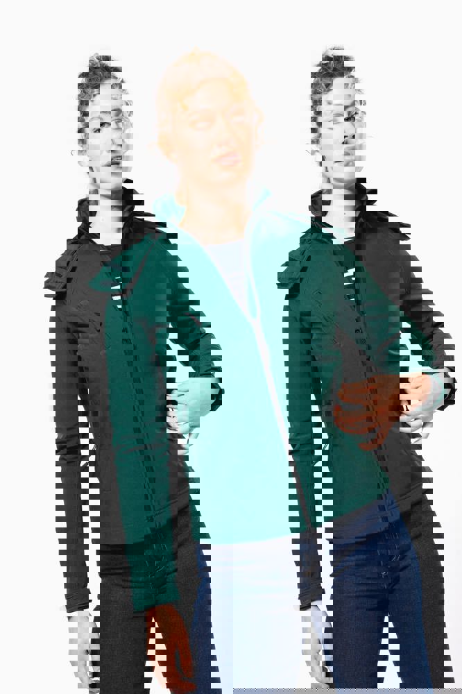Stof in 3 lagen op elkaar geklit. Ademend 1000 g/m²/24h en 5000 mm waterdicht. Buitenkant : 95% polyester en 5% elasthan. Tussenlaag: ademend ventilerend membraan. Binnenkant: anti-pluis polyester. Raglan mouwen. Ritssluiting. 2 voorzakken met rits. 1 borstzak rechts met rits. Afneembare capuchon met aanrijgkoord en klittenbandsluiting. Klittenbandsluiting aan de mouwuiteinden. Verborgen drukkersrits op borsthoogte.