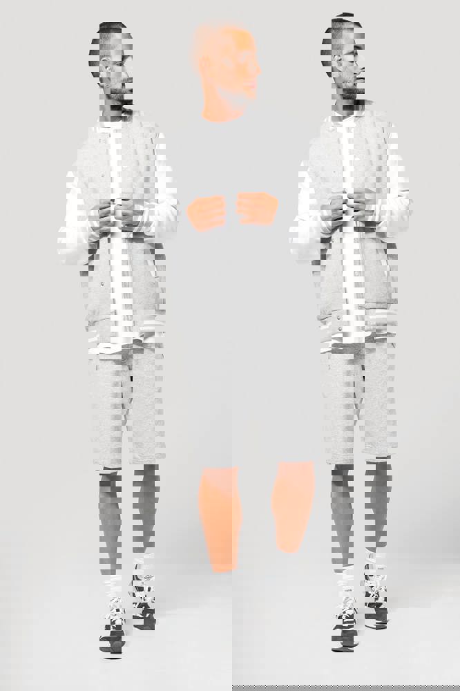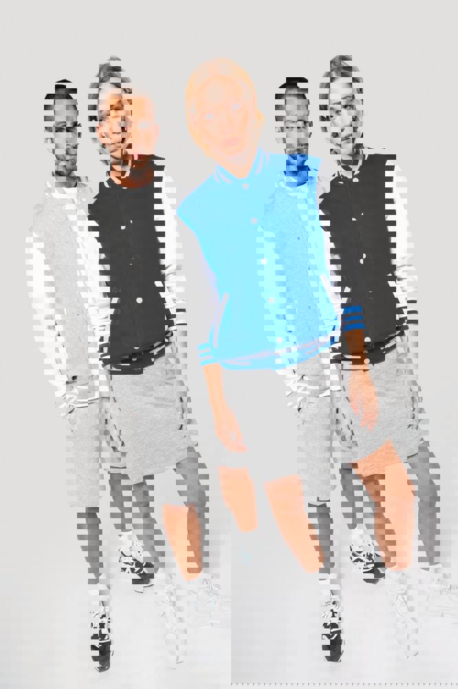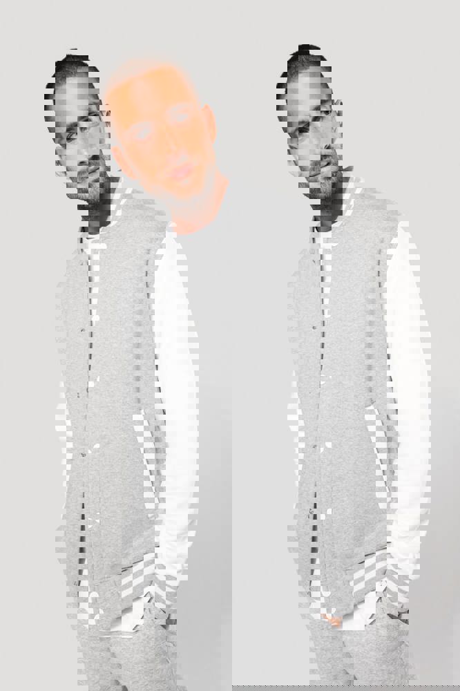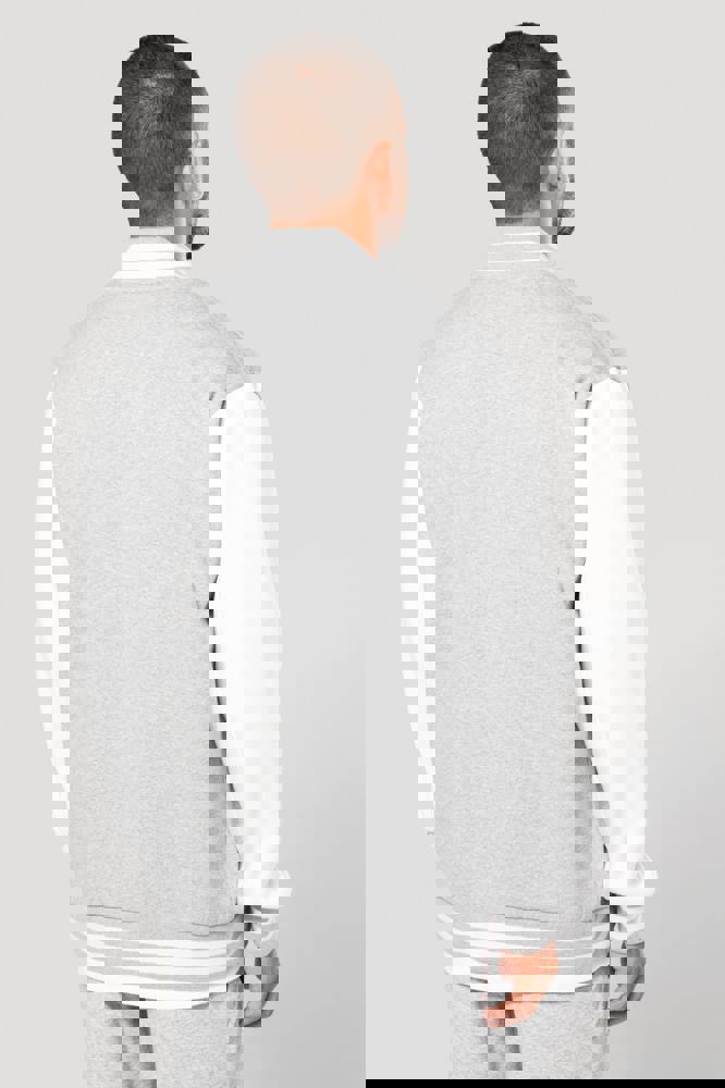 70% katoen / 30% polyester. Geborsteld fleece 3 draden. Contrasterende ingezette mouwen. Sluiting aan de voorkant met contrasterende drukknopen. Ribboord met 2 contrasterende biesjes aan kraag, mouwen en onderkant. 2 contrasterende omzoomde zakken aan de voorkant. Nektape met visgraatmotief en ophanglus in de kraag. Geen merklabel in de kraag, maar enkel een maatlabel voor eenvoudige personalisatie. De legendarische college jacket gaat al vele jaren mee. Hij is alomtegenwoordig: van de straat tot de schoolbanken