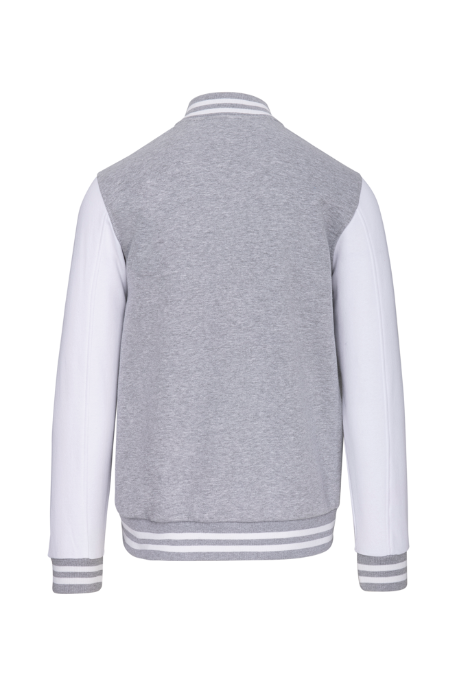 70% katoen / 30% polyester. Geborsteld fleece 3 draden. Contrasterende ingezette mouwen. Sluiting aan de voorkant met contrasterende drukknopen. Ribboord met 2 contrasterende biesjes aan kraag, mouwen en onderkant. 2 contrasterende omzoomde zakken aan de voorkant. Nektape met visgraatmotief en ophanglus in de kraag. Geen merklabel in de kraag, maar enkel een maatlabel voor eenvoudige personalisatie. De legendarische college jacket gaat al vele jaren mee. Hij is alomtegenwoordig: van de straat tot de schoolbanken