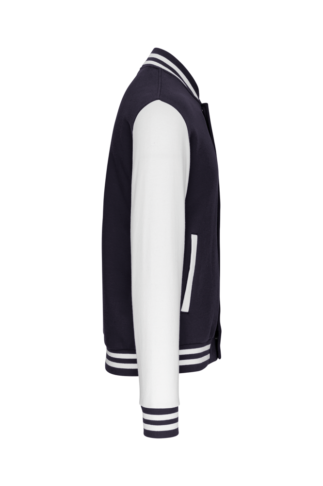 70% katoen / 30% polyester. Geborsteld fleece 3 draden. Contrasterende ingezette mouwen. Sluit aan de voorkant met drukknopen. Ribboord met 2 contrasterende biesjes aan kraag, mouwen en onderkant. 2 omzoomde zakken aan de voorkant. Nektape met visgraatmotief en ophanglus in de kraag. Geen merklabel in de kraag, maar enkel een maatlabel voor eenvoudige personalisatie. Dit mode-icoon is alomtegenwoordig: van de straat tot de schoolbanken en zelfs het podium.