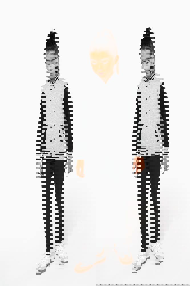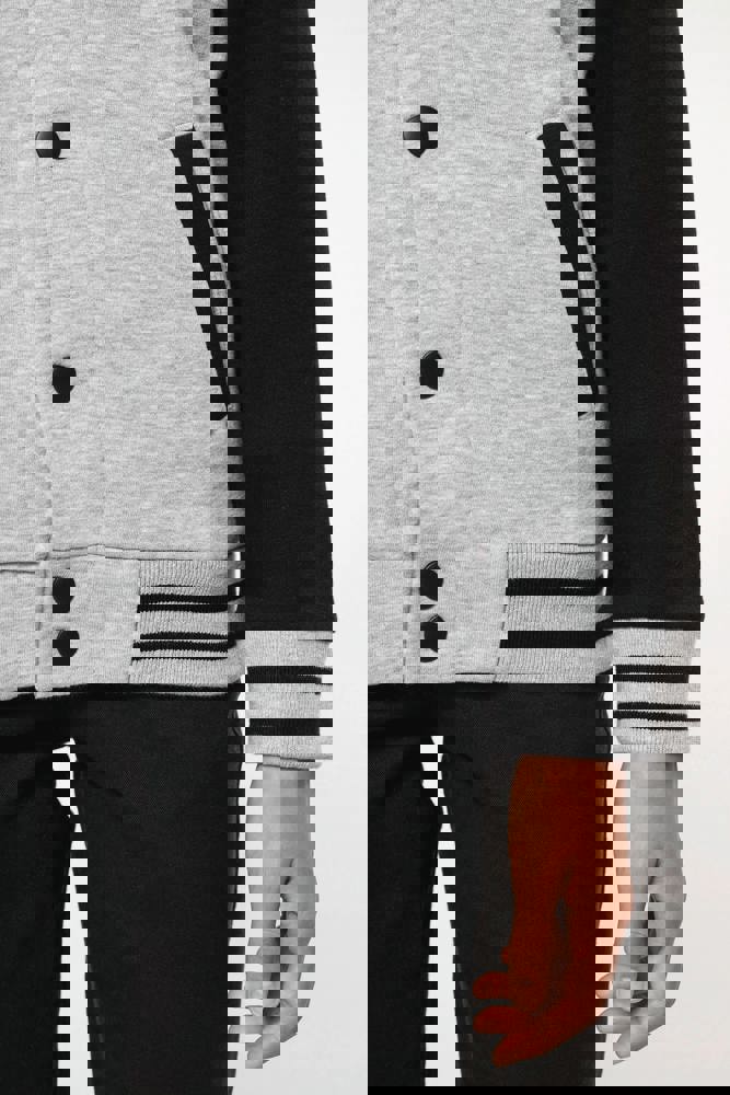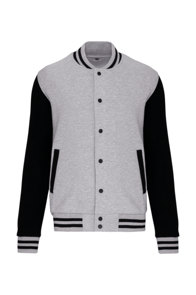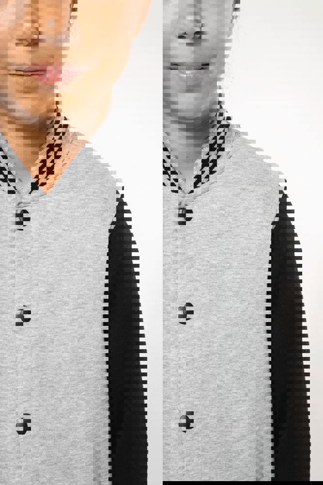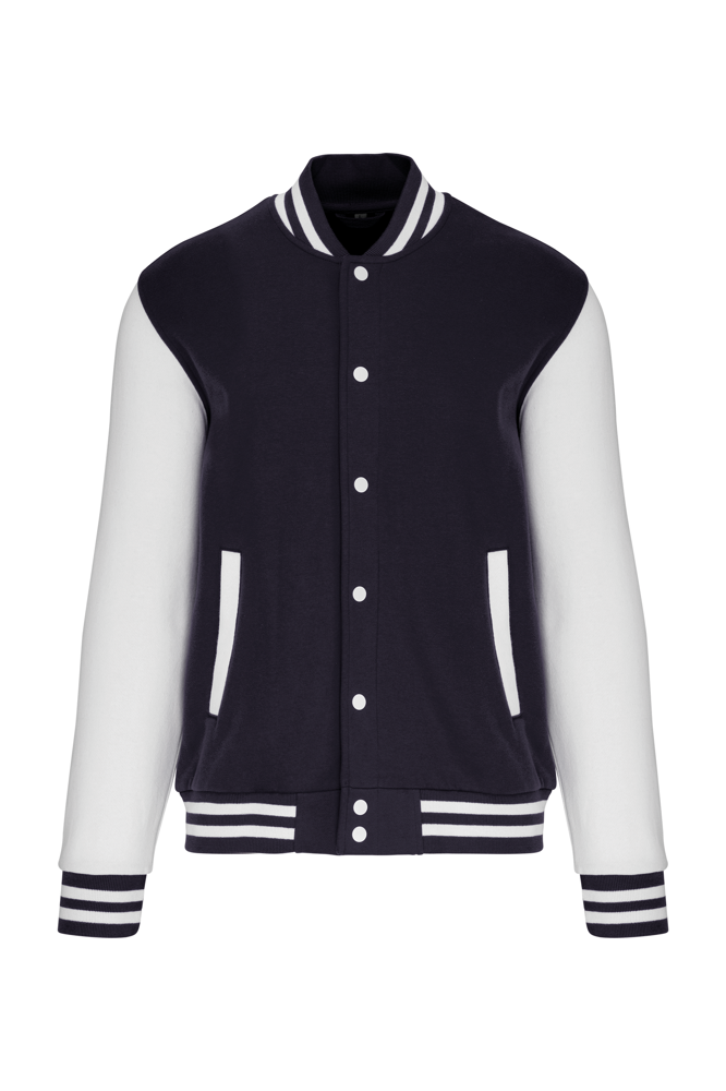 70% katoen / 30% polyester. Geborsteld fleece 3 draden. Contrasterende ingezette mouwen. Sluit aan de voorkant met drukknopen. Ribboord met 2 contrasterende biesjes aan kraag, mouwen en onderkant. 2 omzoomde zakken aan de voorkant. Nektape met visgraatmotief en ophanglus in de kraag. Geen merklabel in de kraag, maar enkel een maatlabel voor eenvoudige personalisatie. Dit mode-icoon is alomtegenwoordig: van de straat tot de schoolbanken en zelfs het podium.