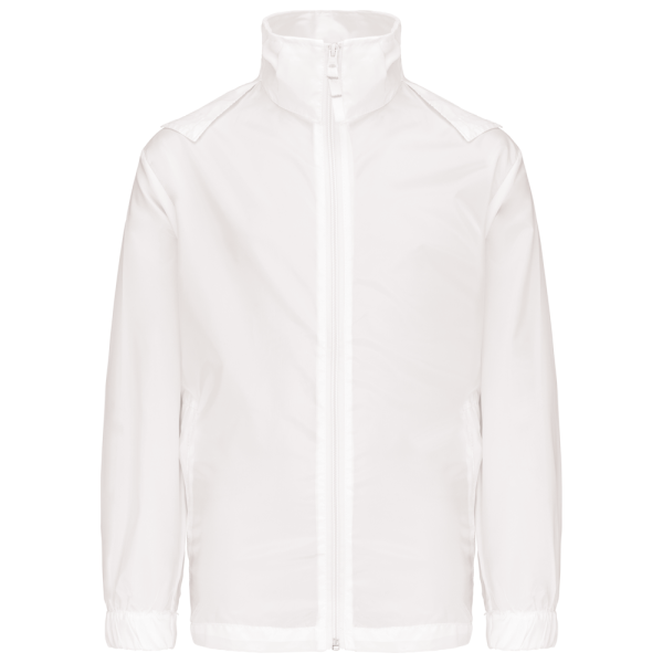 100% polyester. Toon op toon ritssluiting. Capuchon in de kraag met klittenbandsluiting. 2 voorzakken met ritssluiting. Elastische mouwuiteinden. Opvouwbaar volgens het K-Way® systeem.