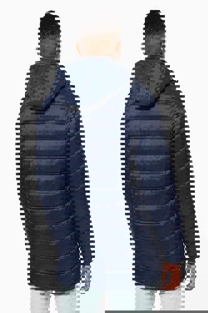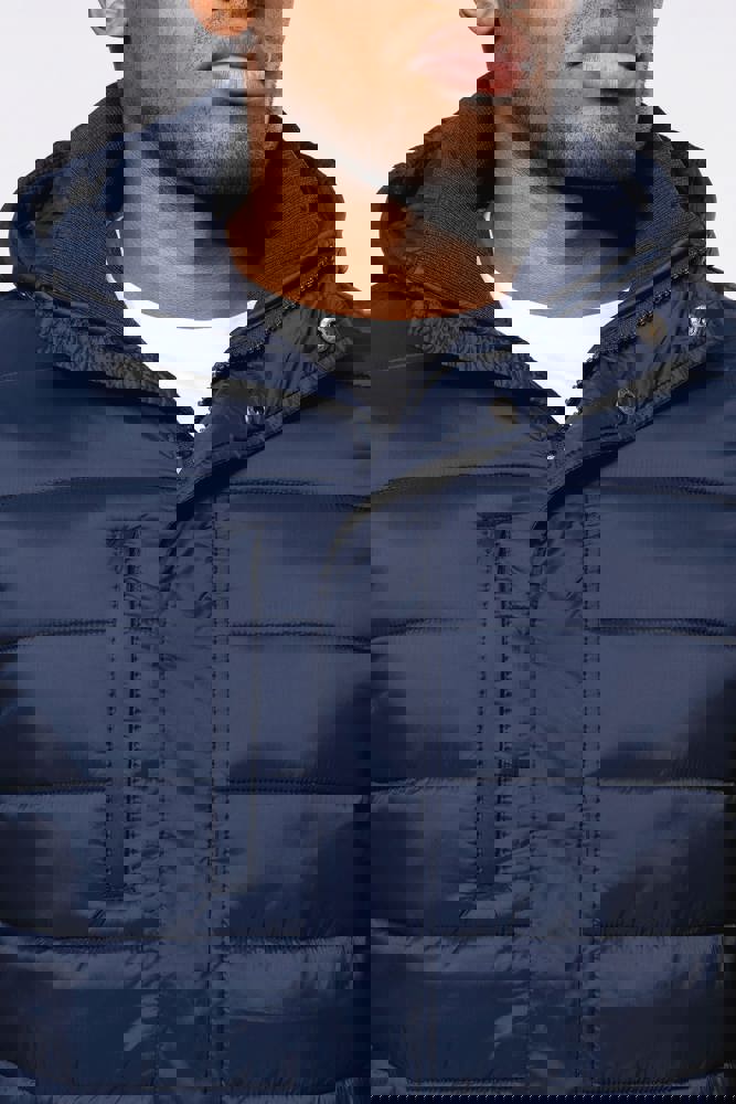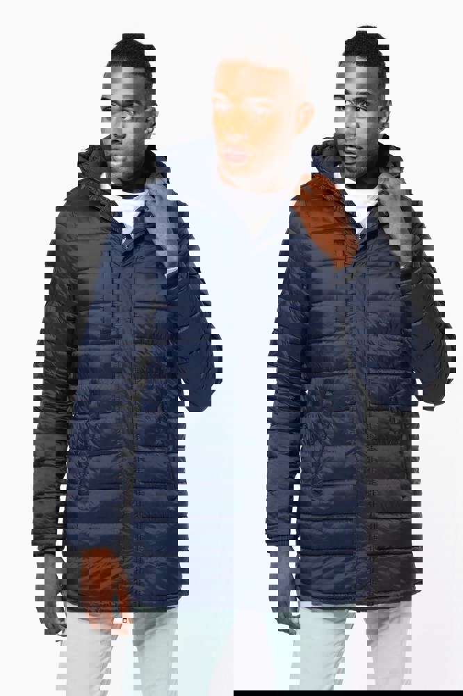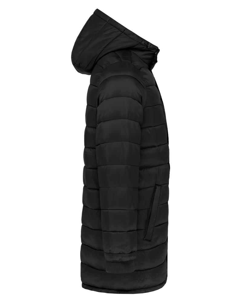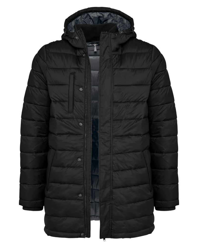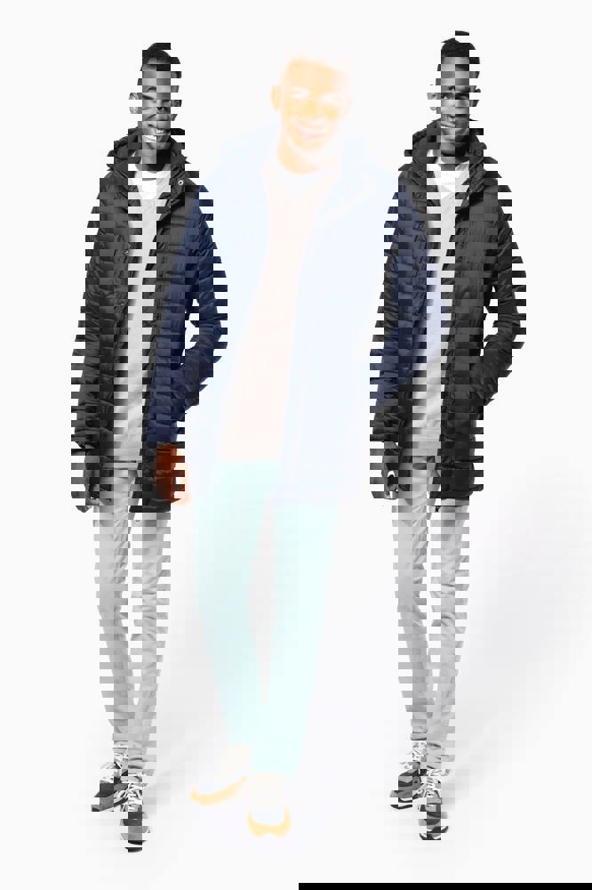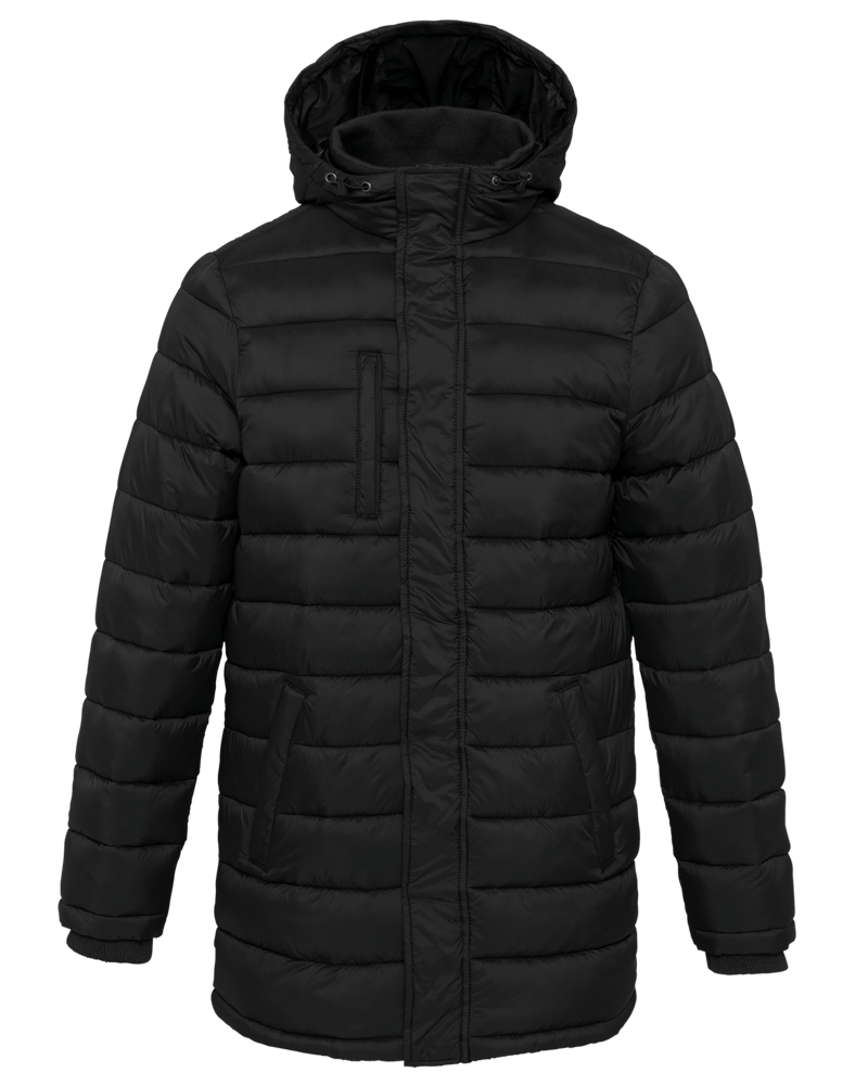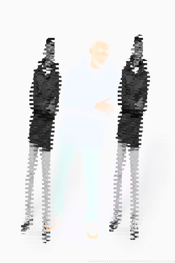100% polyamide. Binnenvoering van polyester. Warm en ultralicht. 2 zakken aan de voorkant en 1 borstzak met rits en biesjes. Verborgen ritssluiting met dubbele schuiver onder een drukknooplijst. Binnenkant kraag en mouwuiteinden in ribboord. Contrasterende binnenkant capuchon en lichaam : Convoy Grey voor Zwart. Effen binnenkant capuchon en lichaam: Navy voor Navy. Geïnjecteerde vulling: het gewicht kan variëren afhankelijk van de zones van het kledingstuk. Het totaalgewicht is indicatief.