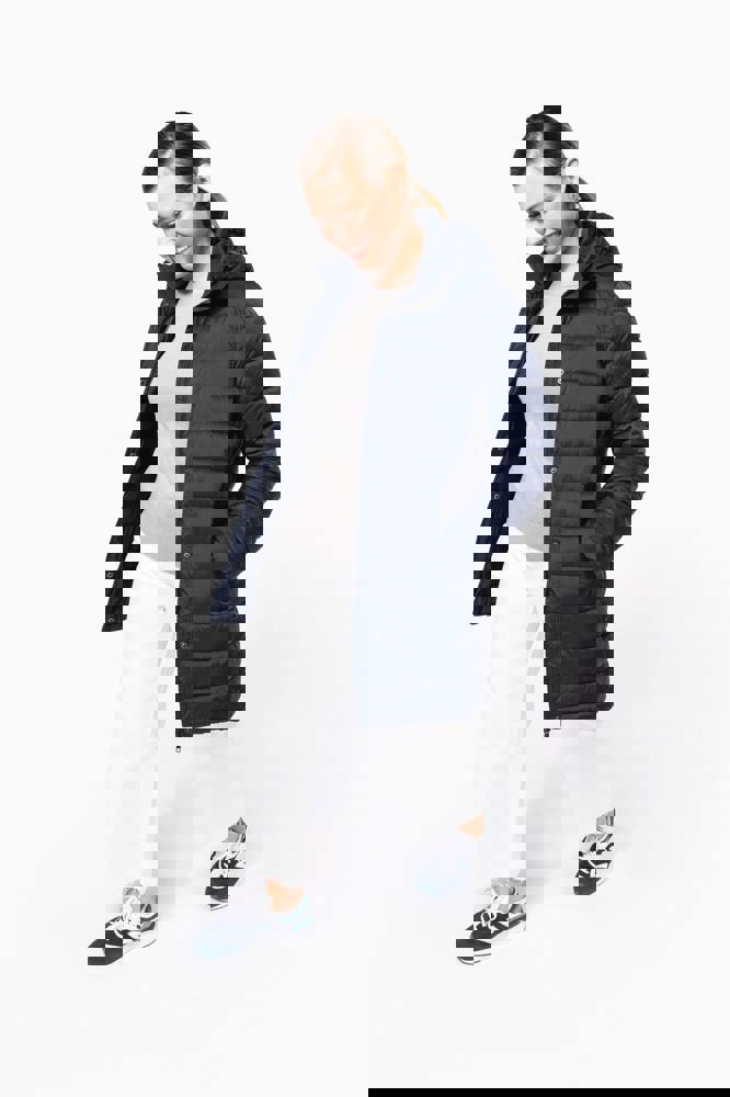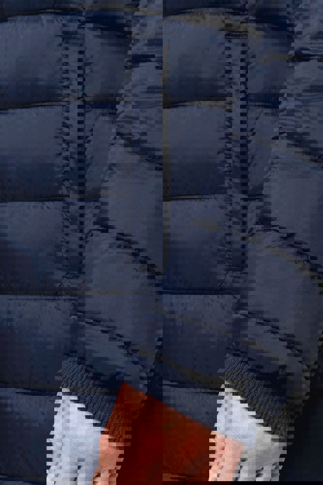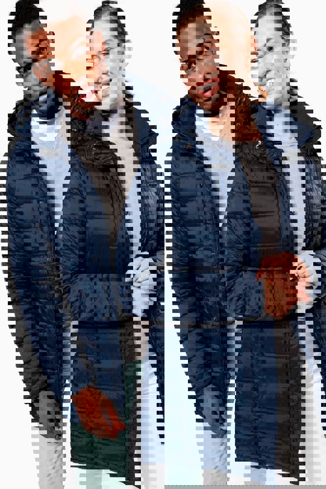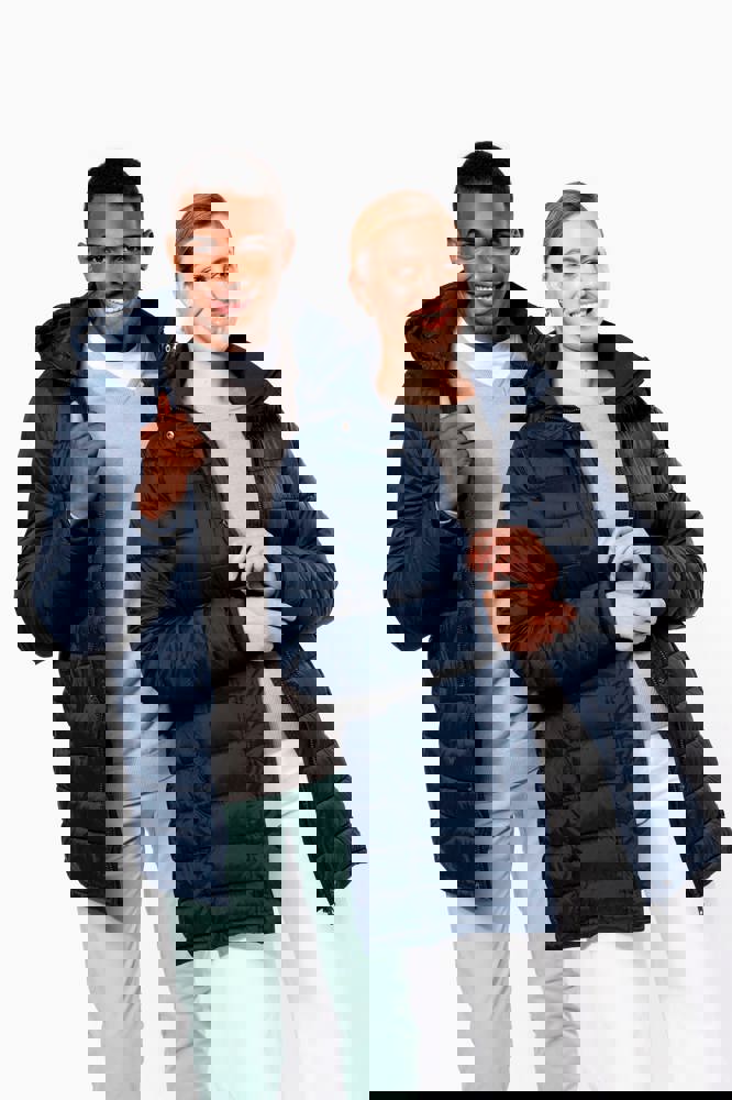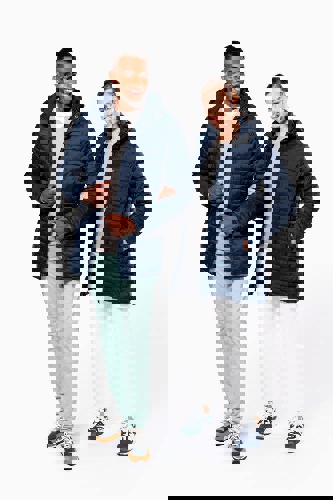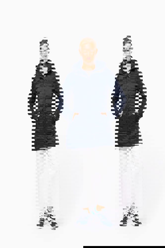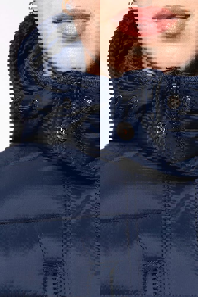 100% polyamide. Binnenvoering van polyester. Warm en ultralicht. Getailleerde snit. 2 zakken aan de voorkant en 1 borstzak met rits en biesjes. Verborgen ritssluiting onder een drukknooplijst. Binnenkant kraag en mouwuiteinden in ribboord. Contrasterende binnenkant capuchon en lichaam : Convoy Grey voor Zwart. Effen binnenkant capuchon en lichaam: Navy voor Navy. Geïnjecteerde vulling: het gewicht kan variëren afhankelijk van de zones van het kledingstuk. Het totaalgewicht is indicatief.