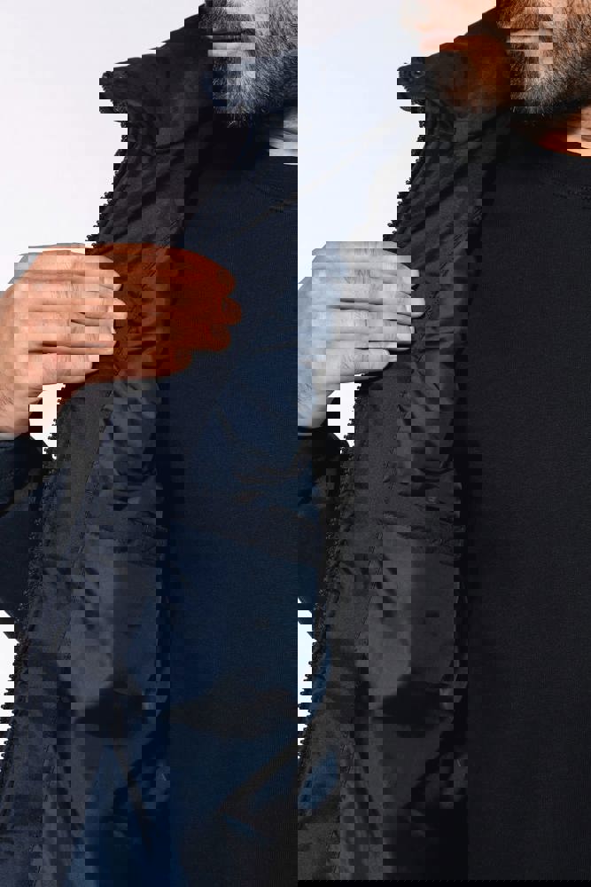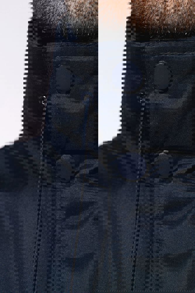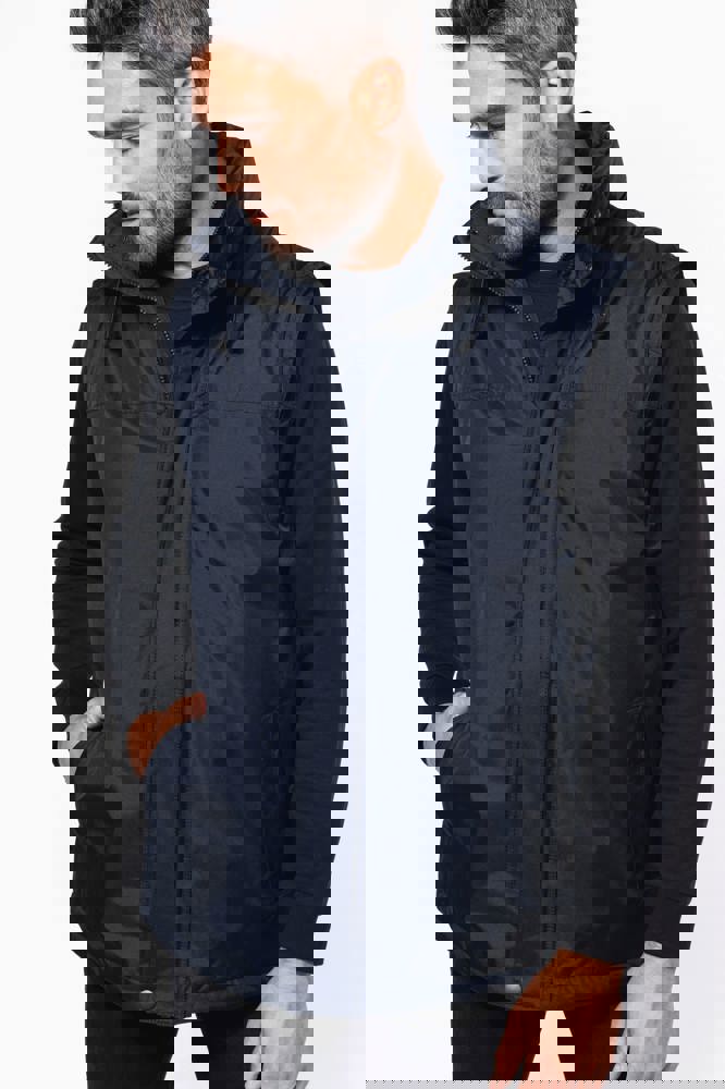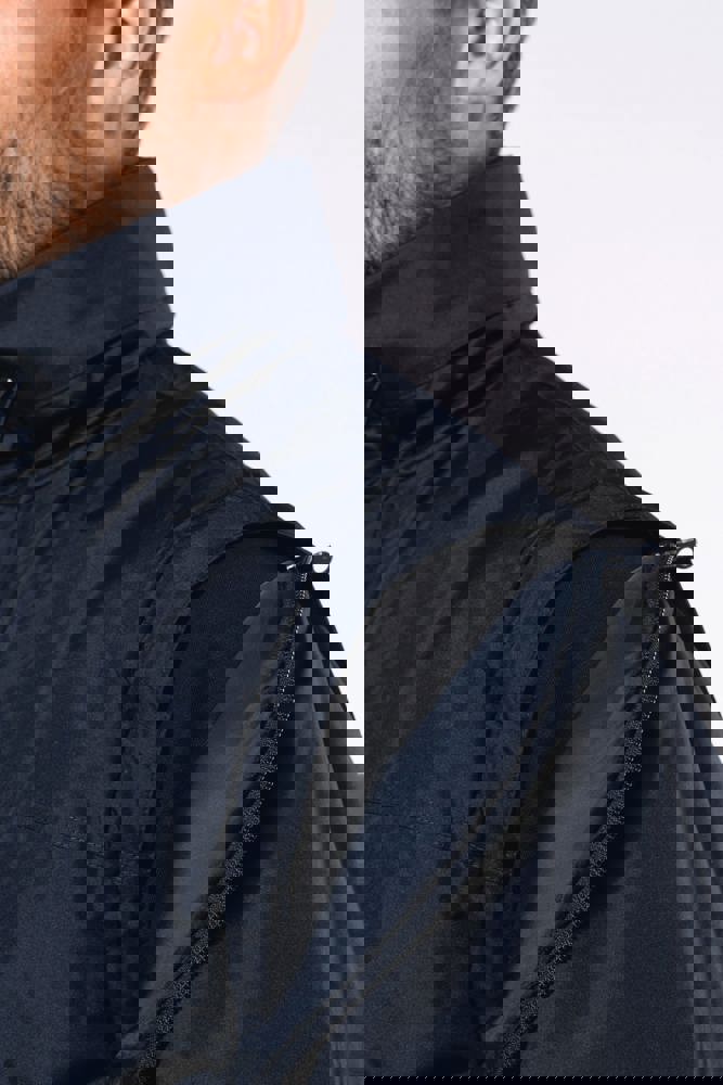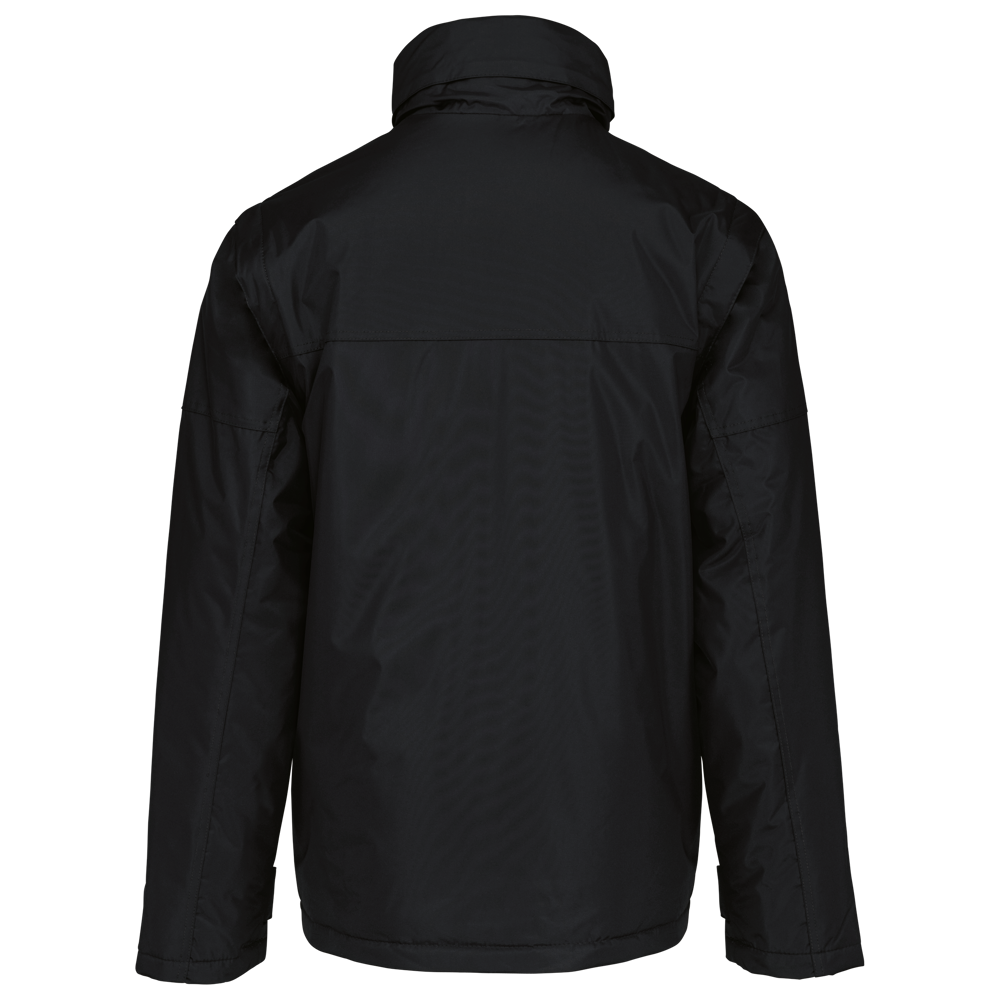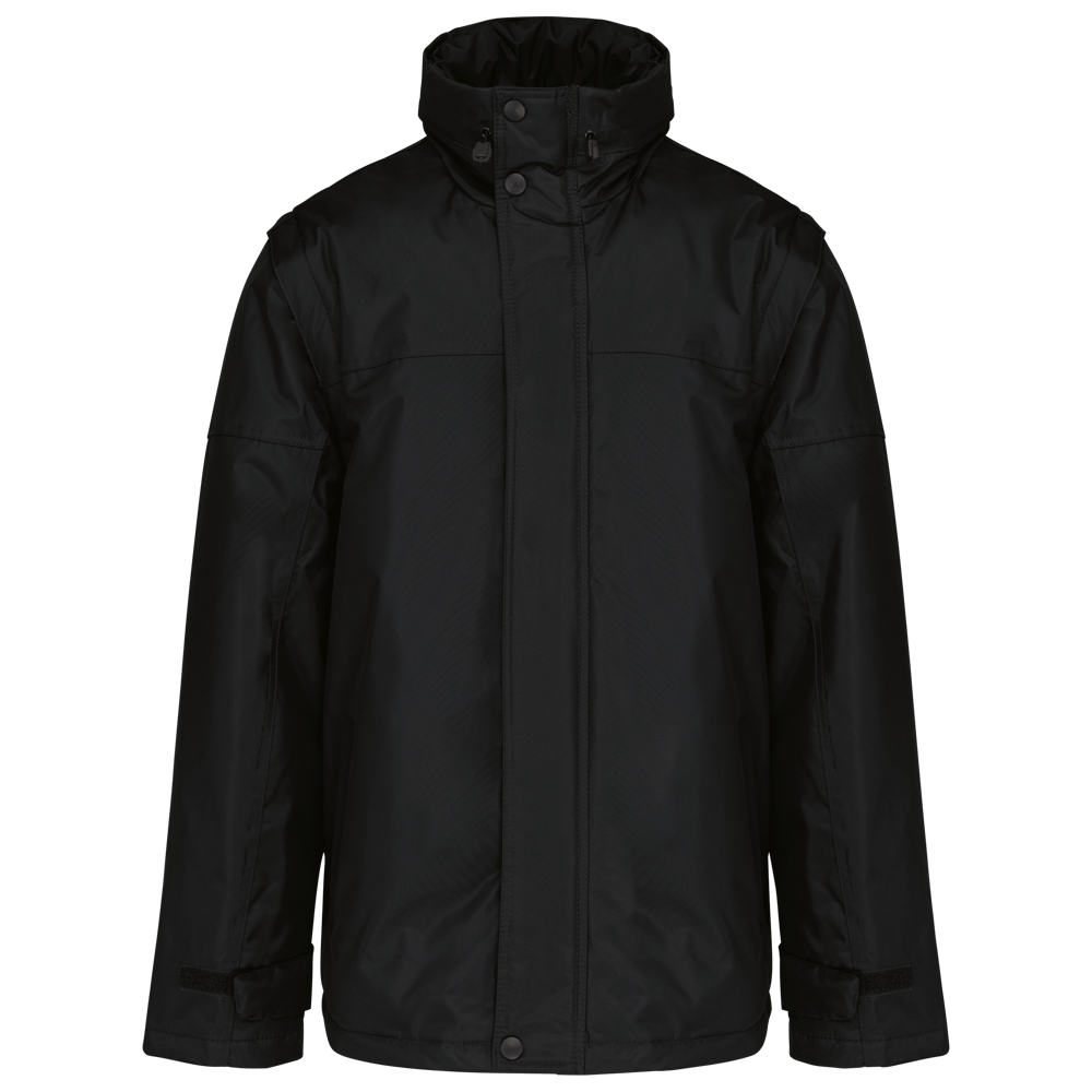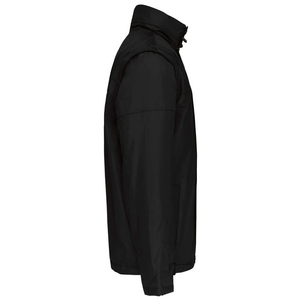 Buitenkant 100% polyester met PVC coating. Binnenvoering 100% polyester gewatteerd. Ritssluiting verborgen onder een lijst van drukknopen. Afritsbare mouwen. Met klittenband verstelbare mouwuiteinden. 2 voorzaken en 1 binnenzak voor GSM. Capuchon met ritssluiting en aanrijgkoord aan de kraag. Aanrijgkoord onderaan met stopper. Drukkersrits.