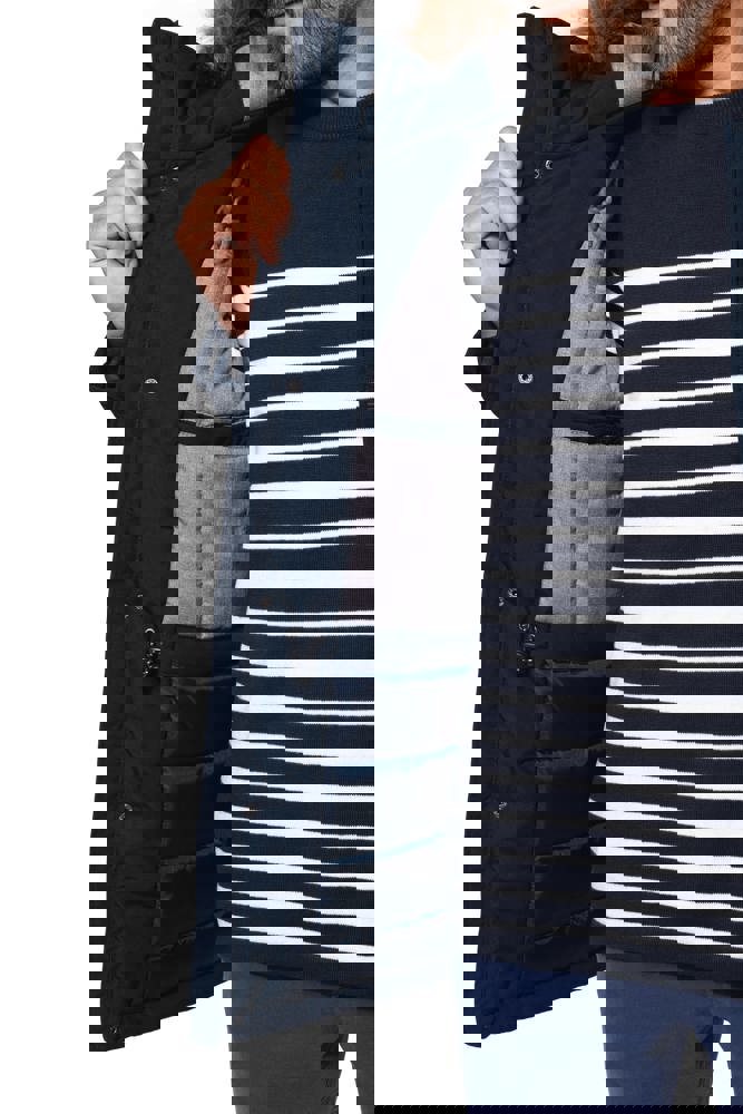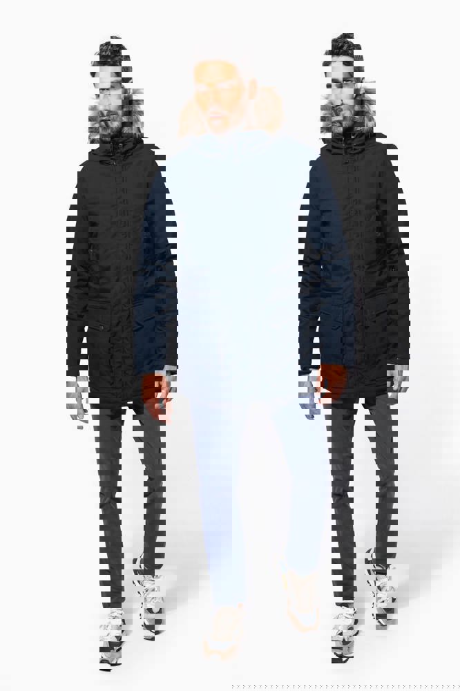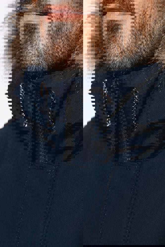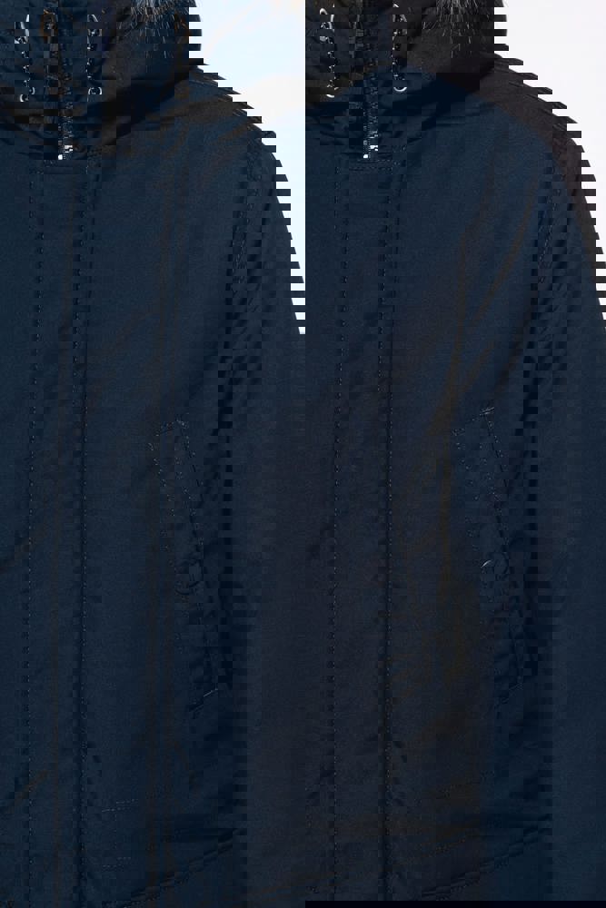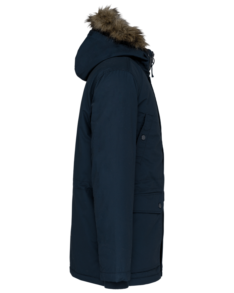 Dik canvas van 65% polyester / 35% katoen. Gewatteerde voering van 100% polyester. Verborgen ritssluiting onder een drukknooplijst. Gawatteerde en gevoerde capuchon met afneembaar nepbont. 4 buitenzakken aan de voorkant: 2 grote zakken met dubbele opening met klep met drukknoop en 2 omzoomde borstzakken met drukknoop. 1 binnenzak met klittenbandsluiting. Taille verstelbaar met aanrijgkoordjes binnenin. Mouwuiteinden in ribboord aan de binnenzijde. 1 rits aan de linkerkant en 1 drukkersrits.