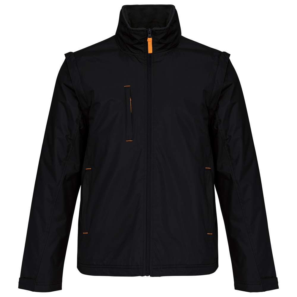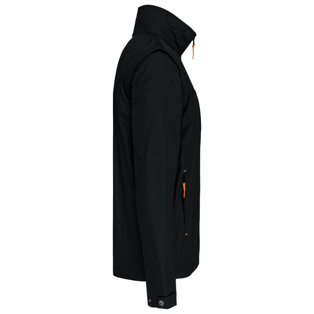 100% polyester met PVC inductie. 100% polyester fleecevoering. De voering van de mouwen is in 100% polyester + 100% polyesterwatten. Zachte stof. Volledige ritssluiting. 3 zakken met ritssluiting. Afritsbare mouwen. Verstelbare mouwuiteinden. Contrasterende ritstrekker, nektape en stopstiksels. 3 binnenzakken (2 met rits en 1 gsmzakje). Aanrijgkoord aan de binnenkant de jas. Capuchon verwerkt in de kraag. Drukkersrits.