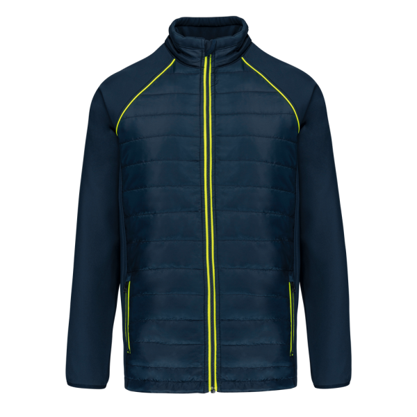 100% polyester. Softshell 2 lagen, in de 4 richtingen rekbare stof voor meer bewegingsruimte en met binnenlaag in fleece voor meer warmte op de mouwen en de schouders. Voorkant en achterkant : 100% polyester 75 g taf 230T met coating. Waterafstotende stof. 2 ritszakken aan de voorkant. 1 naametiket links aan de binnenkant. Contrasterende bies aan de mouwopeningen en in de kraag. Ritssluiting op de voorkant en contrasterende zakken. Blinde drukkersrits onderaan. Ideaal voor dagelijks gebruik.