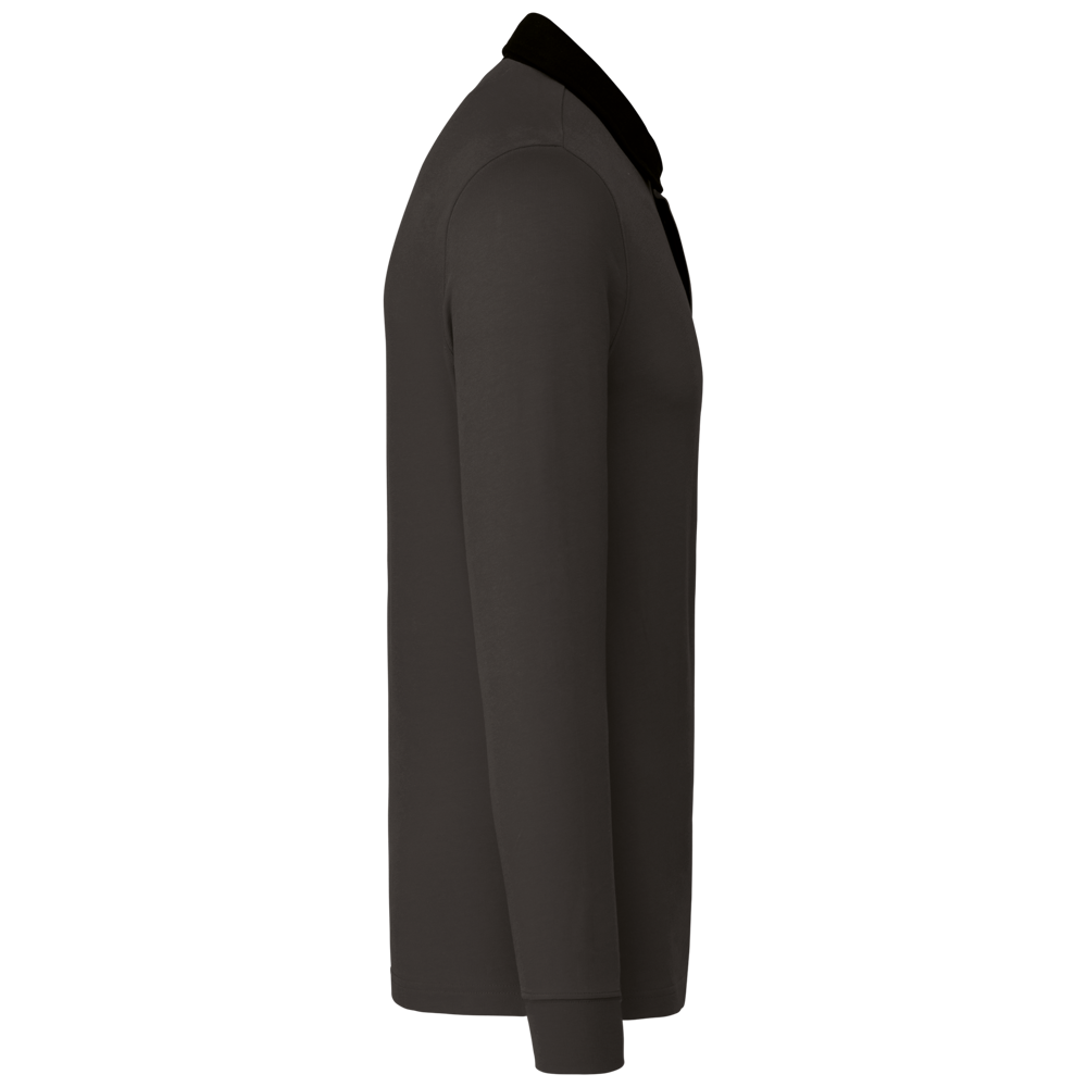 100% Gekamd katoen. Voorgekrompen gekamd jerseykatoen. Kraag in contrasterend wit twillkatoen (behalve de kleuren Red en Dark Grey, die een zwarte kraag hebben). Lijst met 3 knopen. Mouwuiteinden in 1x1 ribboord. Afwerking met visgraatmotief op de binnenzijde van de kraag en aan de zijsplitten.