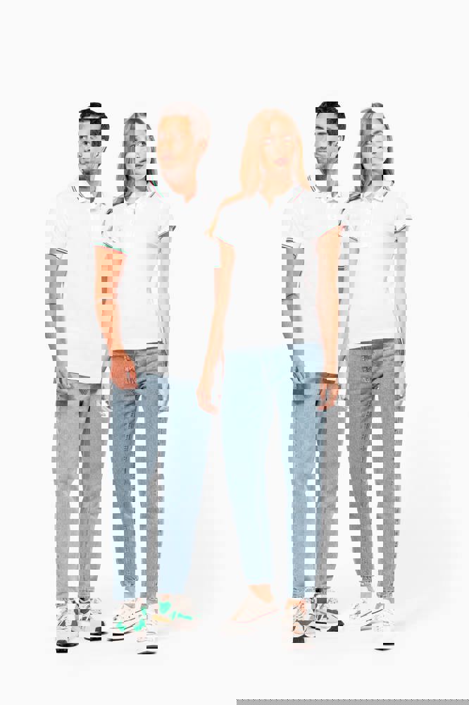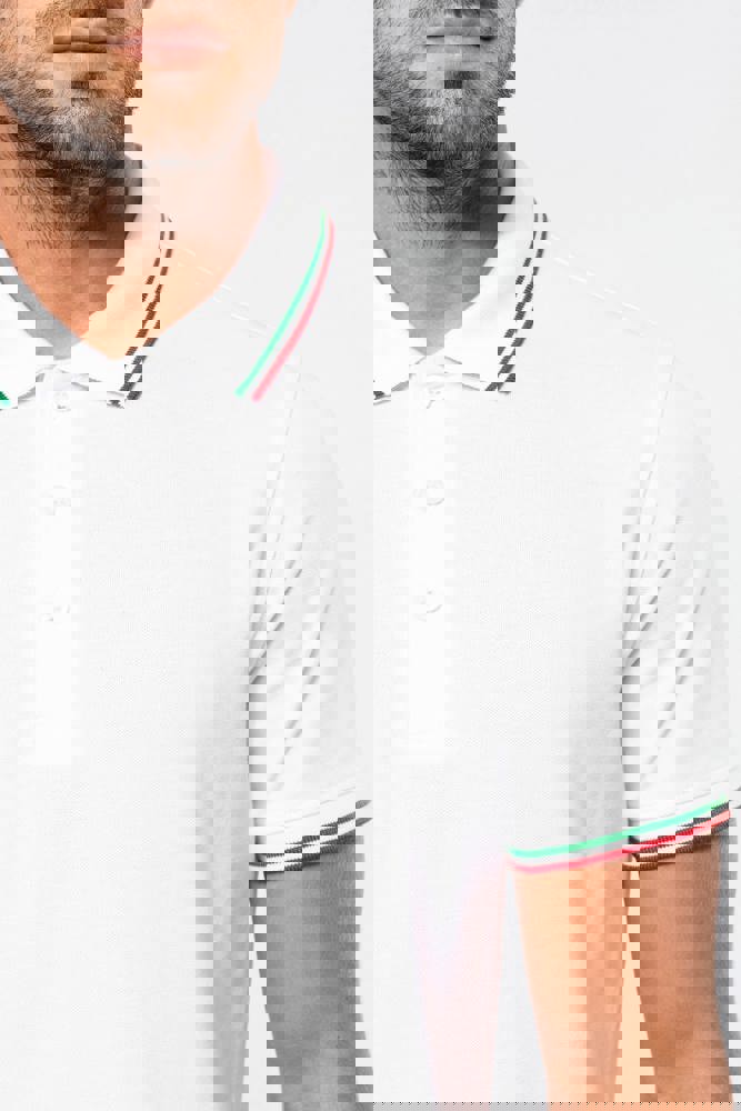 100% katoen piqué. Knooplijst met 3 knopen. Nektape en zijsplitjes in contrastkleur. Afwerking in rib met gecontrasteerde rand aan de kraag en mouwuiteinden. Afgewerkt met dubbele stiksels onderaan.