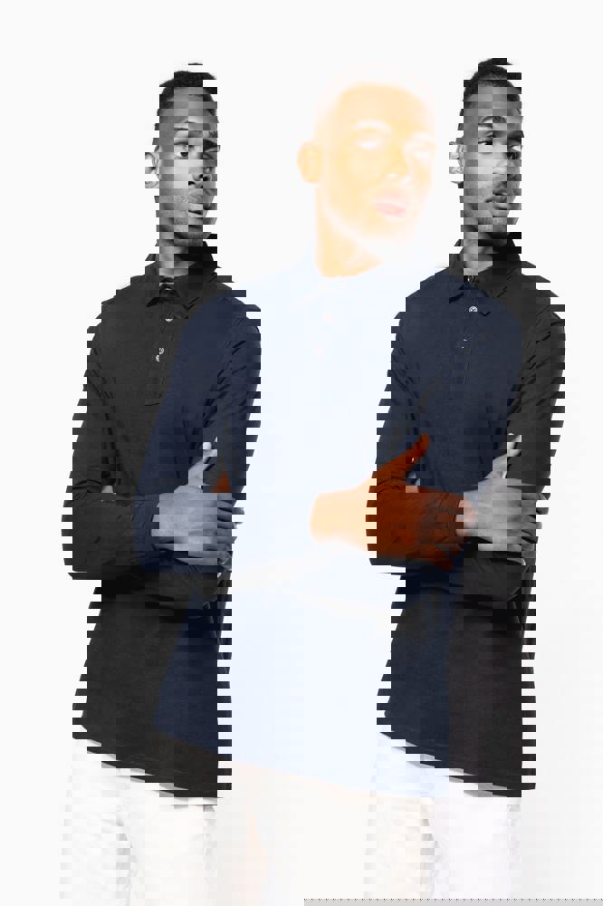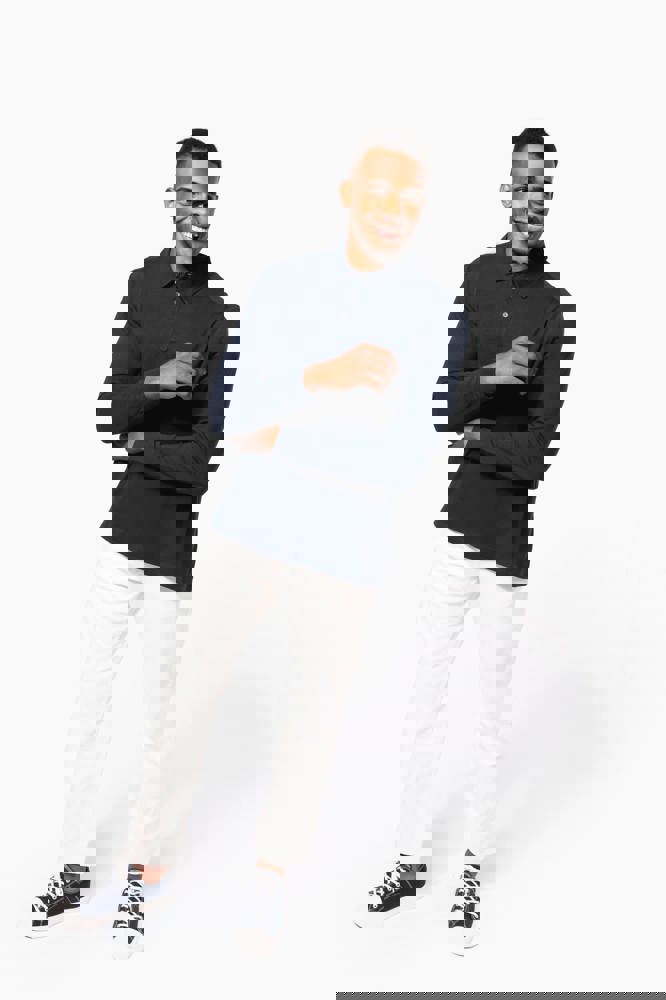 100% katoen (Heather Grey: 65% katoen / 35% polyester - Oxford Grey : 90% katoen / 10% viscose). Katoenen, gekamde jersey. Hemdskraag. Knooplijst met 3 metalen knopen. Inzetstuk op de schouder. Mouwuiteinden in ribboord. Dubbel stiksel aan de onderkant.