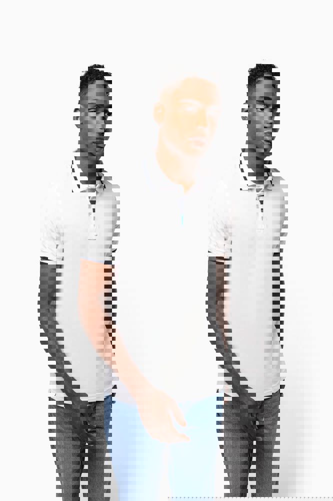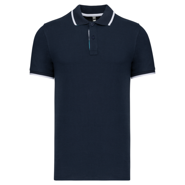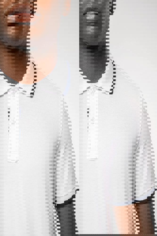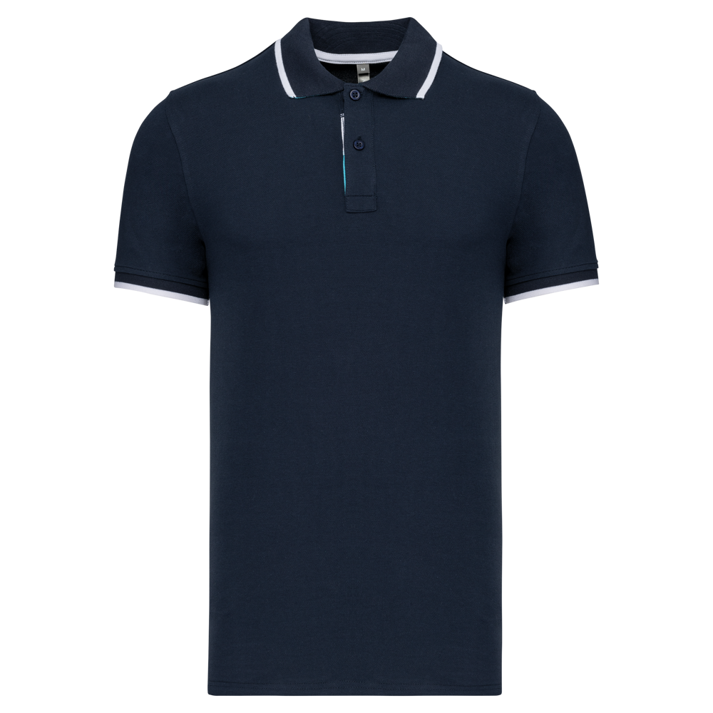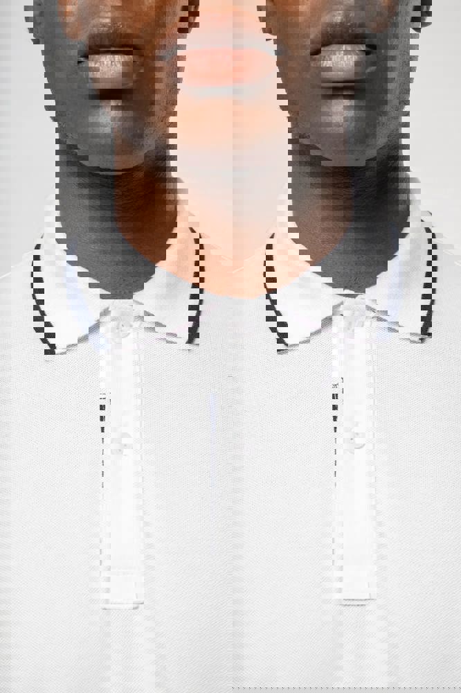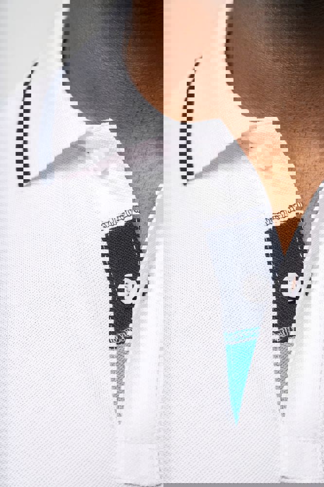 100% katoen piqué. Kraag in rib met bies in contrastkleur aan de boven- en onderkant (behalve White/ Navy : geen contrast onder de kraag, alleen een dunne rode rand onder de sluiting). Nektape en zijsplitjes in contrastkleur. Fantasie knooplijst met 2 knopen. Mouwuiteinden in rib met bies in contrastkleur. Afwerking met dubbele stiksels aan de onderkant. De kraag is verstevigd aan de achterkant en kan omhoog of omlaag gedragen worden.