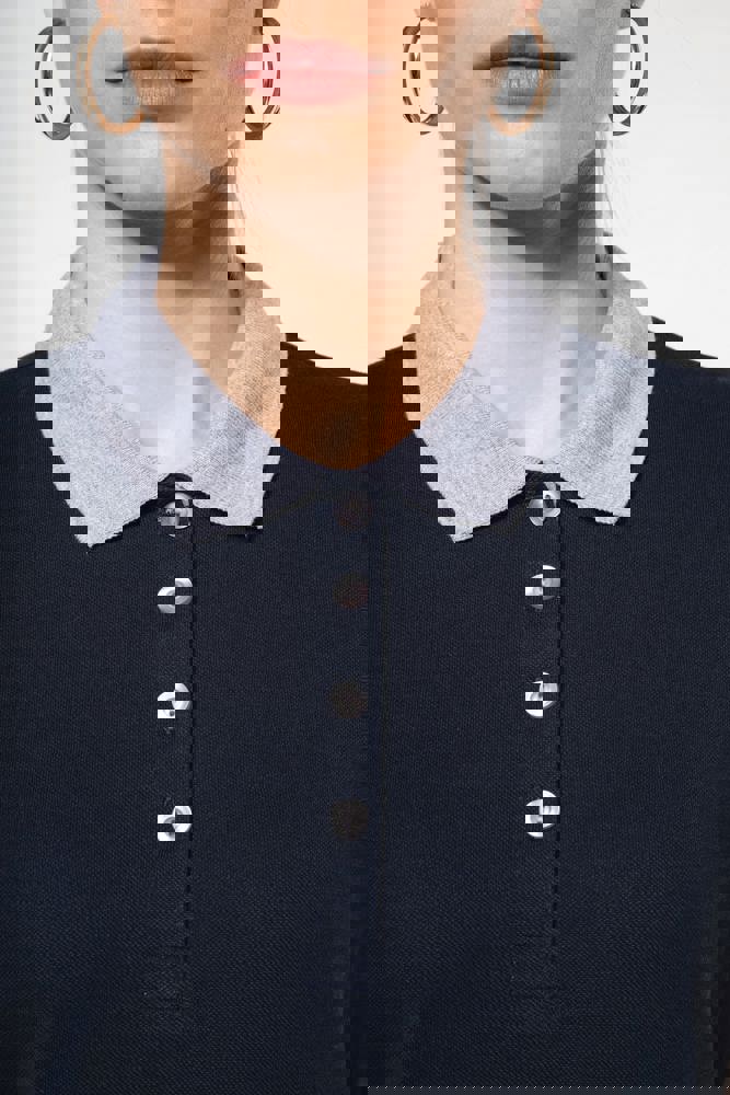 100% voorgekrompen katoen piqué (Oxford Grey: 90% katoen / 10% viscose). Contrasterende ribboord aan de kraag en mouwuiteinden. Contrasterende zijsplitten en nektape in de kraag. Aan de binnenzijde een contrasterende knooplijst met 4 knopen. Afwerking met dubbel stiksel onderaan.
