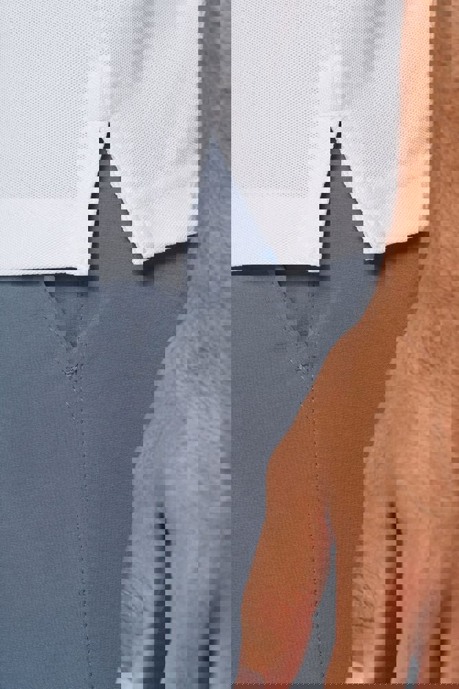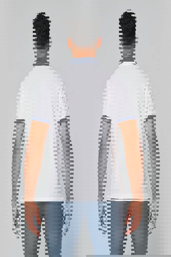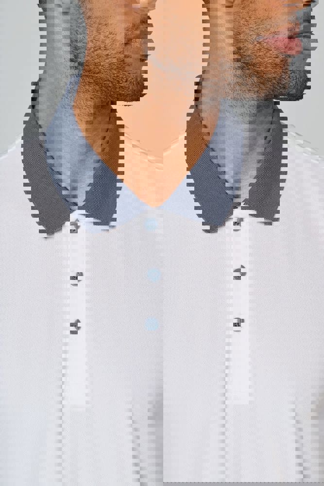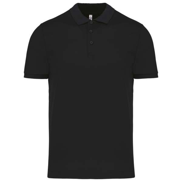 100% piquépolyester Cool Plus®. Rechte snit en moderne look. Kraag en mouwuiteinden in contrasterende ribboord. Knoopsluiting met 3 knopen (contrasterend of effen, afhankelijk van het model). Zijsplitten.