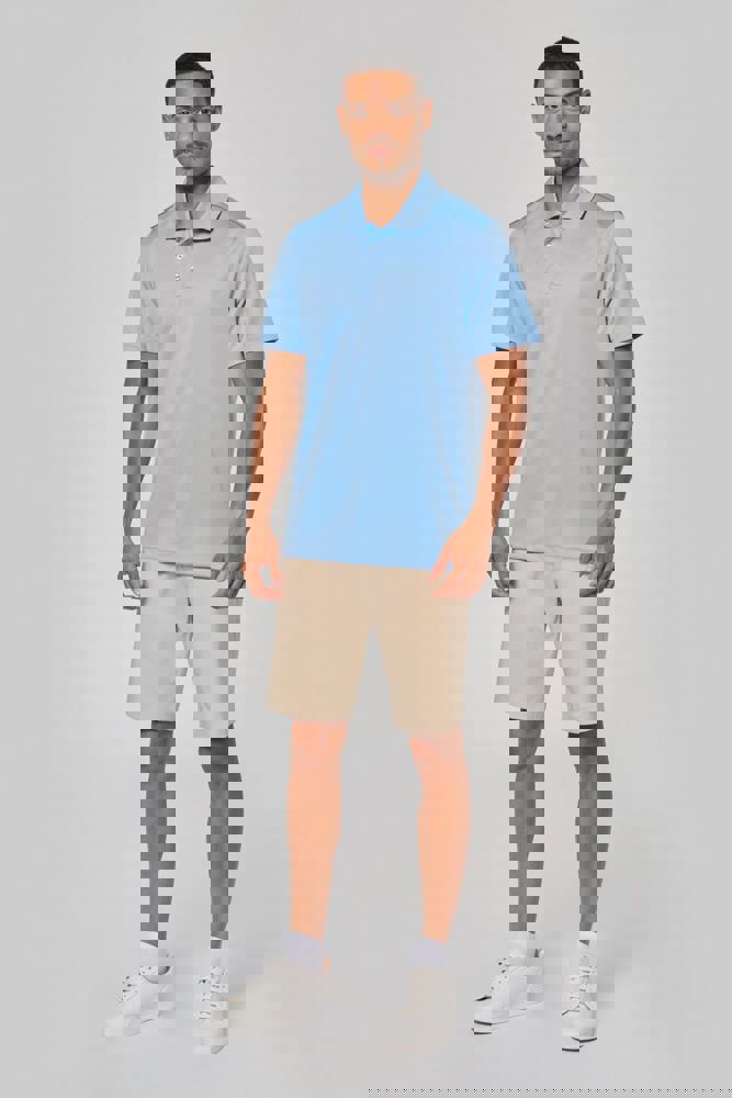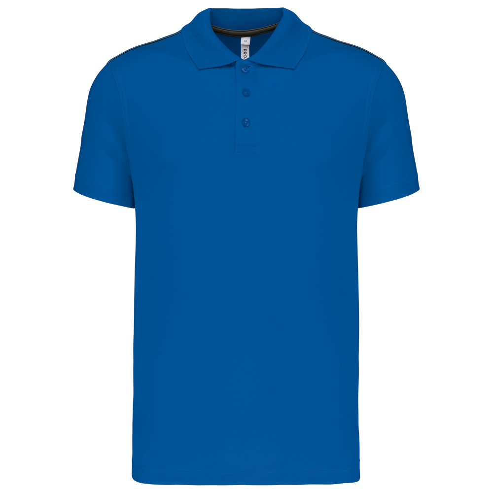 100% polyester interlock. Sneldrogende stof. Kraag in rib. Knooplijst met 3 knopen. Nektape en zijsplitjes in contrastkleur. Contrastkleurige bies op de schouders. Afwerking met dubbele stiksels aan de mouwuiteinden en onderaan.