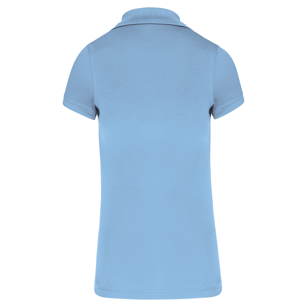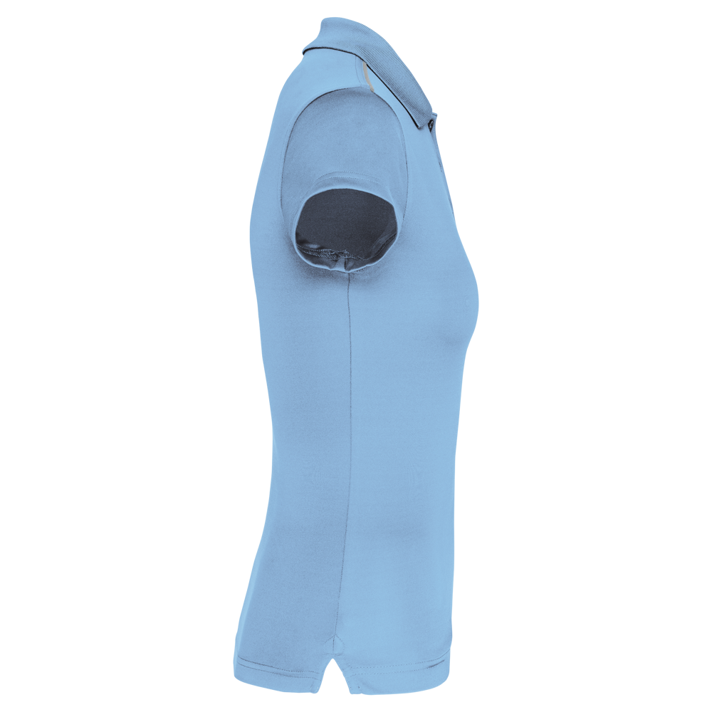 100% polyester interlock. Sneldrogende stof. Kraag in rib. Knooplijst met 3 knopen. Nektape en zijsplitjes in contrastkleur. Contrastkleurige bies op de schouders. Afwerking met dubbele stiksels aan de mouwuiteinden en onderaan.