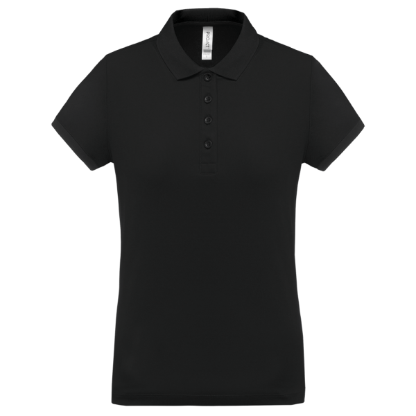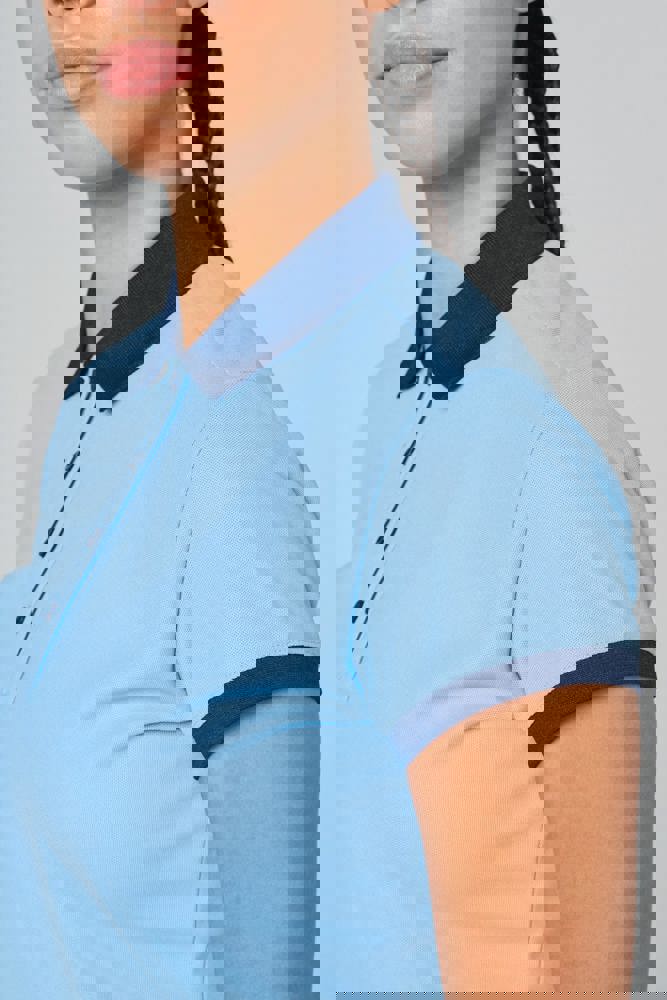 100% piquépolyester Cool Plus®. Getailleerde snit en moderne look. Kraag en mouwuiteinden in contrasterende ribboord. Knoopsluiting met 4 knopen (contrasterend of effen, afhankelijk van het model). Zijsplitten.