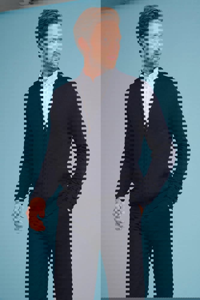 50% katoen / 50% acryl. Unisex cardigan met bomberkraag in fijn tricot van gauge 12. Semi-façonnémouwen. Ritssluiting aan de voorkant, met metalen rits en schuiver. 1x1 ribboord aan kraag, mouwuiteinden en onderkant. Omzoomde zakken vooraan.