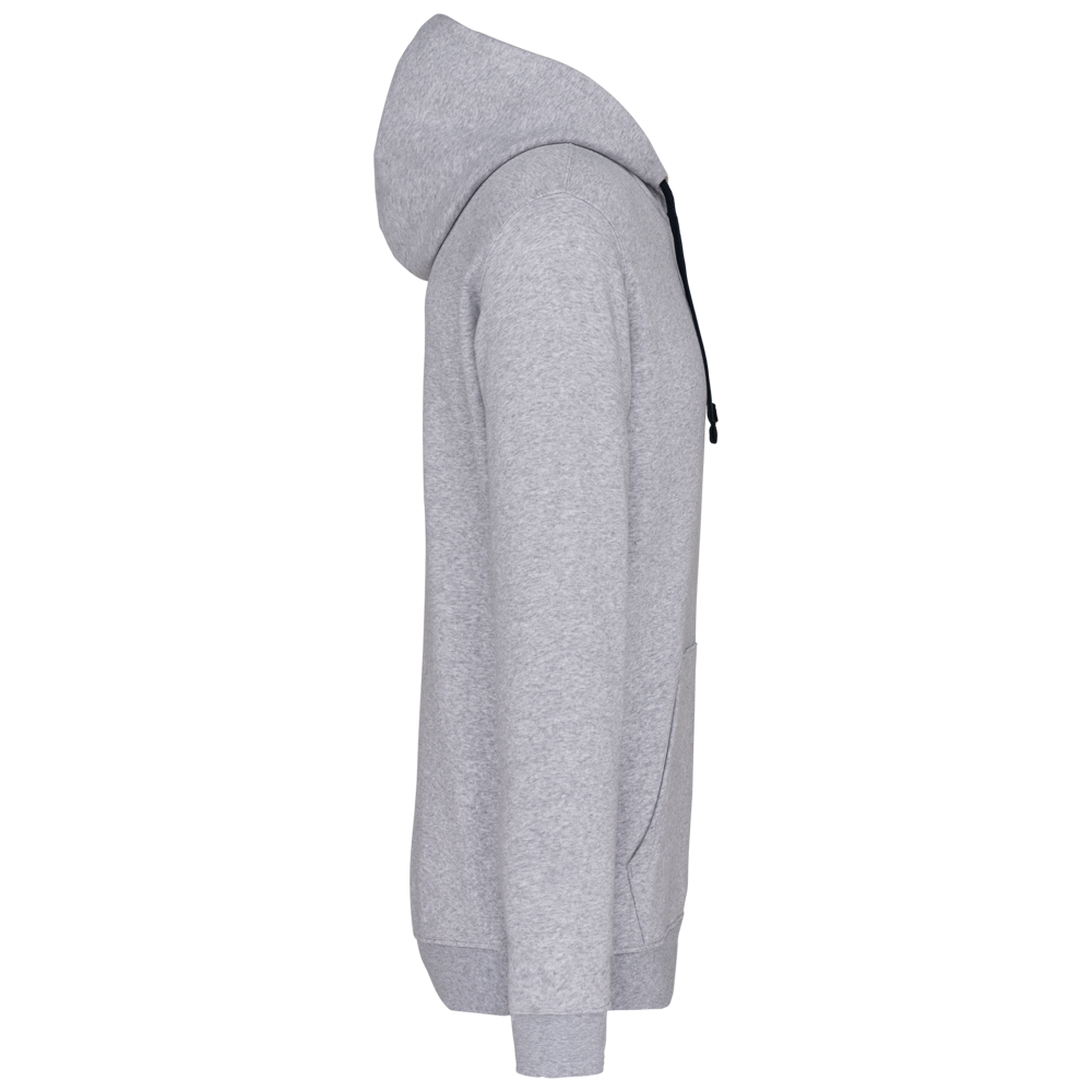 80% katoen / 20% polyester. Gekamd katoen. Geborsteld fleece aan de binnenkant. 'Kangaroe' zak aan de voorkant met gaatje voor draadje en lusje aan de kraag voor mp3-oortjes. Afwerking in ribboord. Gevoerde en gecontrasteerde capuchon met aanrijgkoordjes.